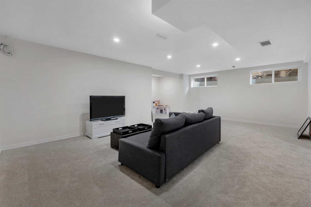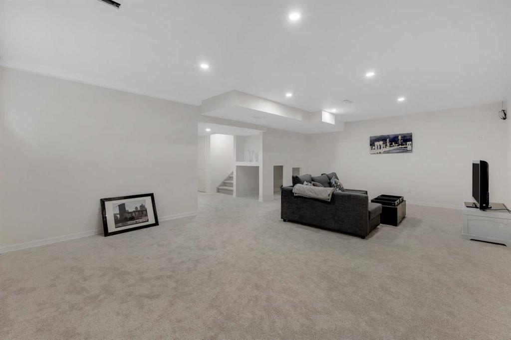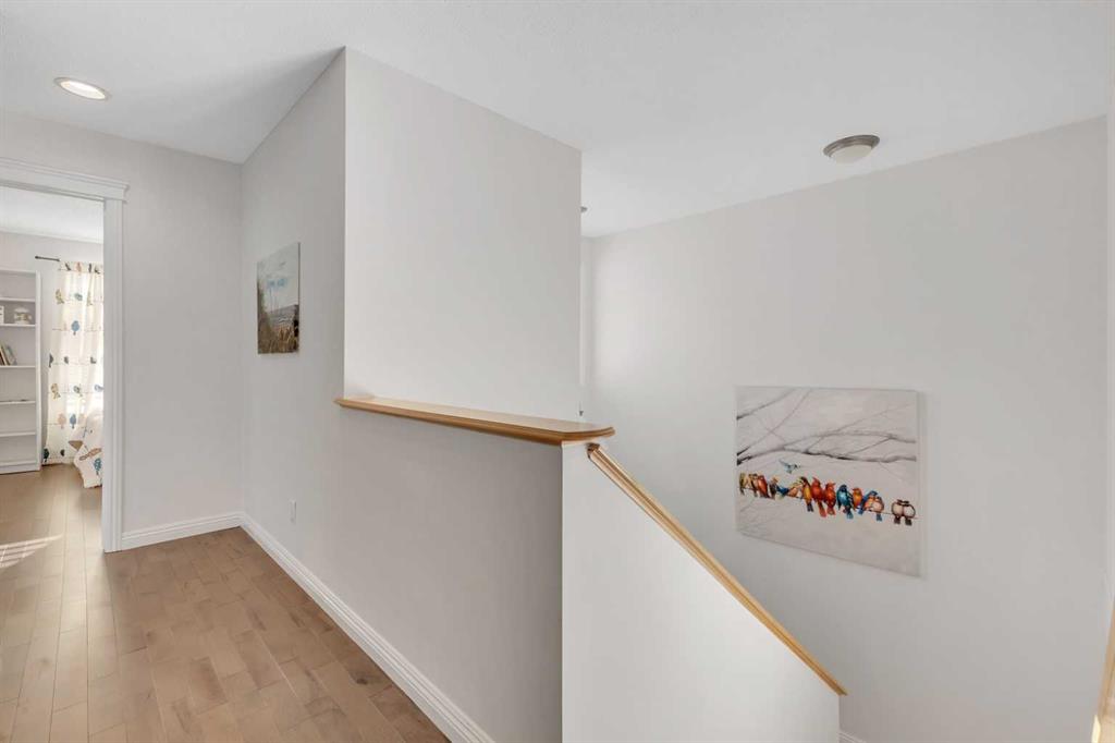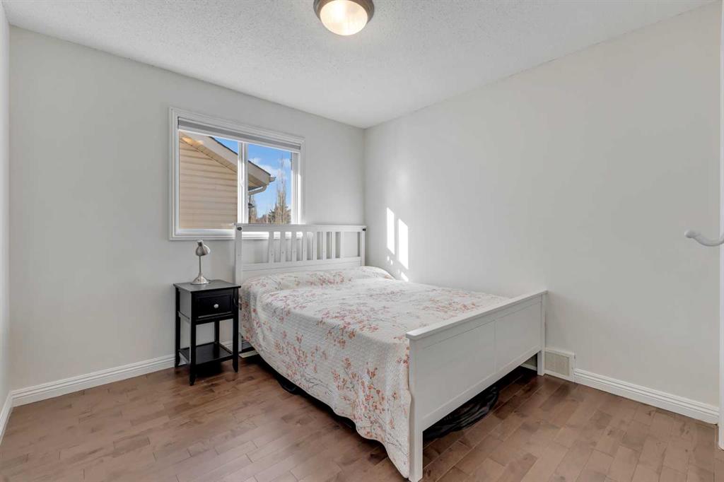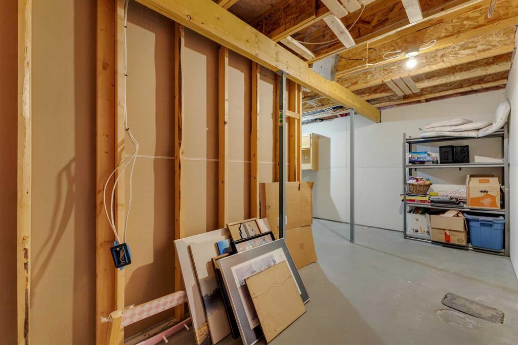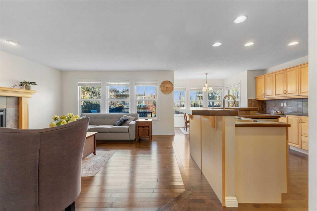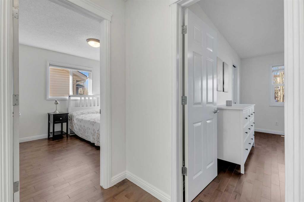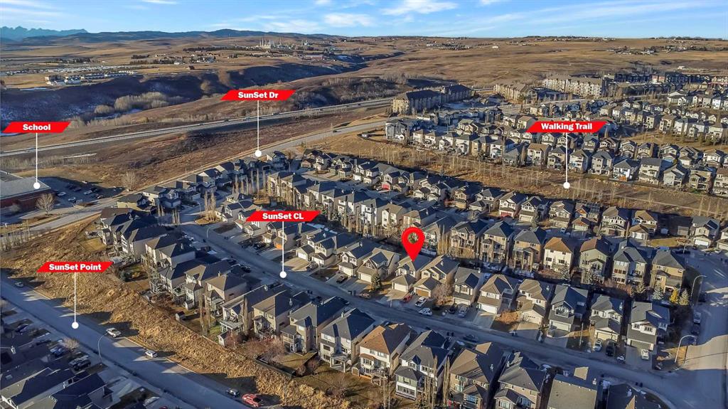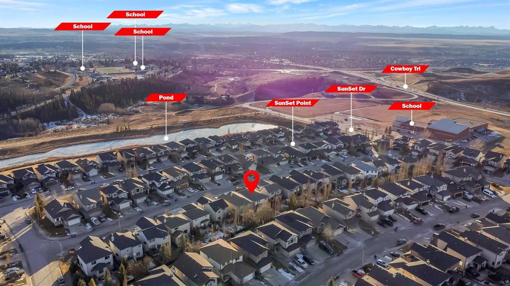 Cochrane's popular Sunset Ridge has green spaces, walking paths, ravines, schools, shopping & more. This beautiful 2 Storey is close to Cochrane Ranch House, Sunset Pond, Sunset Park & St. Timothy Jr/Sr school. Stepping inside the home you will see natural light throughout. Tastefully remodeled, all 3 levels flow nicely with same color tones & design. The main floor flex room is the first room you see when you enter. Great space for home office, dining room, or sitting area. By garage entrance, leading from the laundry, there are 10 coat hooks for your family. The laundry room has stackable washer/dryer, counter space, broom closet & extra cabinets. Walking into the kitchen & family room area will impress you, all the counter space, kitchen island, work area etc. Kitchen has 9 drawers, 8 double cabinets, 3 single door cabinets & 1 corner cabinet. Corner pantry has 4 levels of wire racks. A great kitchen for the cook & baker. One area of the cabinets has a bit lower counter, where you can put a couple chairs. The kitchen nook is bright with a door(glass insert)leading to the back yard.The other 2 walls have double height windows, again natural light. Watch kids play in the yard while having your coffee or cooking. The island has plenty of room to fit 5 stools. If you are the family that gravitates to the kitchen, you will love this kitchen. Front room is adjacent to the kitchen. The gas fireplace has wooden moldings around the fireplace & rich brown toned tile, matching the kitchen backsplash. One side of family room looks to the back yard through the same size of windows the kitchen nook has. Soft colored walls, lighter colored wooden cabinets in the kitchen & around the fireplace, rich brown counter tops & dark hardwood floors, this home is tastefully renovated. Going up the stairs to the bedrooms, you are greeted with light flowing in from very high south facing windows. Newer light beige carpet in on the stairs. Where there is carpet, it is all the same. Reaching the top of the stairs, to the right you have a 4 piece main bath, large towel cabinet in bathroom behind the door, medicine cabinet on the wall by sink, toilet & tub/shower. All colors flow with the main level. 2 bedrooms face the front of the home. One has a walk in closet, the other has a regular closet. To the left of the stairs are 2 other large bedrooms, one the master & a 4th bedroom! The 5 pce. ensuite is very spacious with separate shower & a tile seat by the large soaker tub.The large walk in closet in the master bedroom has ample hanging & shelving space. Going to the basement we see a huge bright family room, an area for a gym or pool table & a built in play house. There is rough in for a bathroom & a storage area. The double attached garage is drywalled & has upper cabinets & work bench's. At the side of the home is a small storage shed. The fenced back yard has a deck & patio stones. A perfect yard for the kids & adults to play.