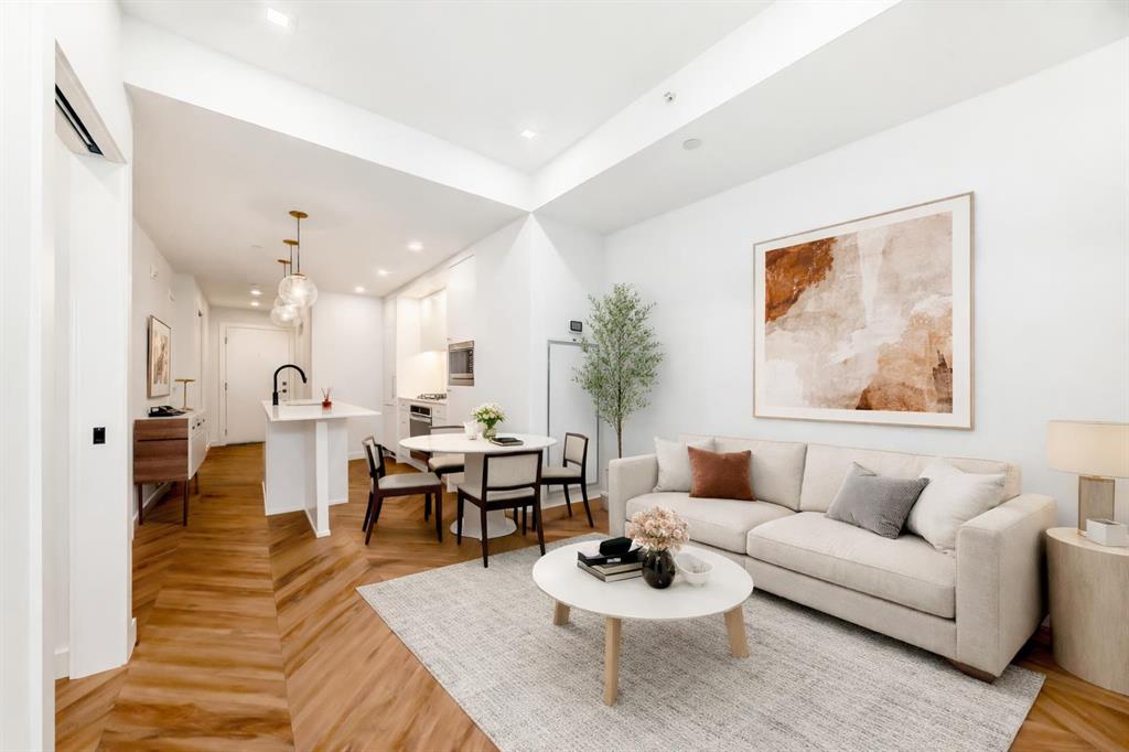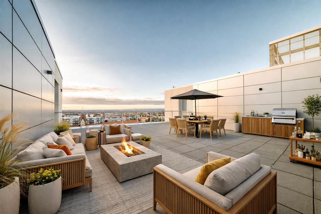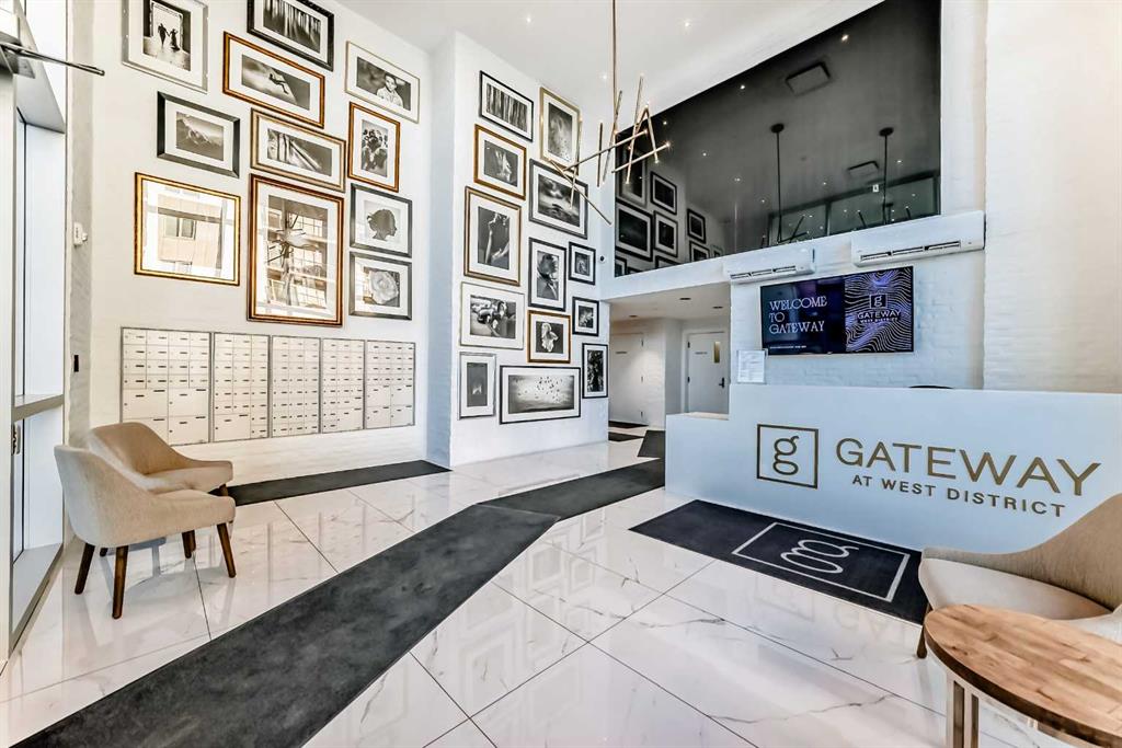 Welcome to Gateway by TRUMAN, ideally located in the vibrant, master-planned West District. This concrete-constructed residence offers modern luxury, thoughtful design, and exceptional urban convenience. This two-bedroom, two-bathroom home with titled underground parking features chevron wide-plank flooring, designer lighting, and flat-painted ceilings for a timeless, upscale feel. Floor-to-ceiling windows flood the space with natural light and capture mountain views, while central air conditioning ensures year-round comfort. The chef-inspired kitchen blends style and function with matte custom cabinetry, brushed-gold accents, quartz countertops and backsplash, under-cabinet lighting, and a generous eating bar. Premium appliances include a gas cooktop, wall oven, 36” Fisher & Paykel integrated refrigerator, paneled dishwasher, and statement hood fan. The open living and dining areas extend to a private terrace, ideal for outdoor lounging and entertaining. The primary suite features a walk-in closet and spa-inspired ensuite with quartz counters, mosaic tile, and a glass-enclosed shower. The second bedroom offers flexibility as a guest room or home office with access to a stylish four-piece bath. Additional highlights include in-suite laundry, ample storage, and secure underground parking. Residents enjoy premium amenities such as a rooftop patio, owner’s lounge, concierge, bike storage, EV charging, and visitor parking.