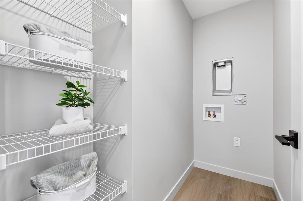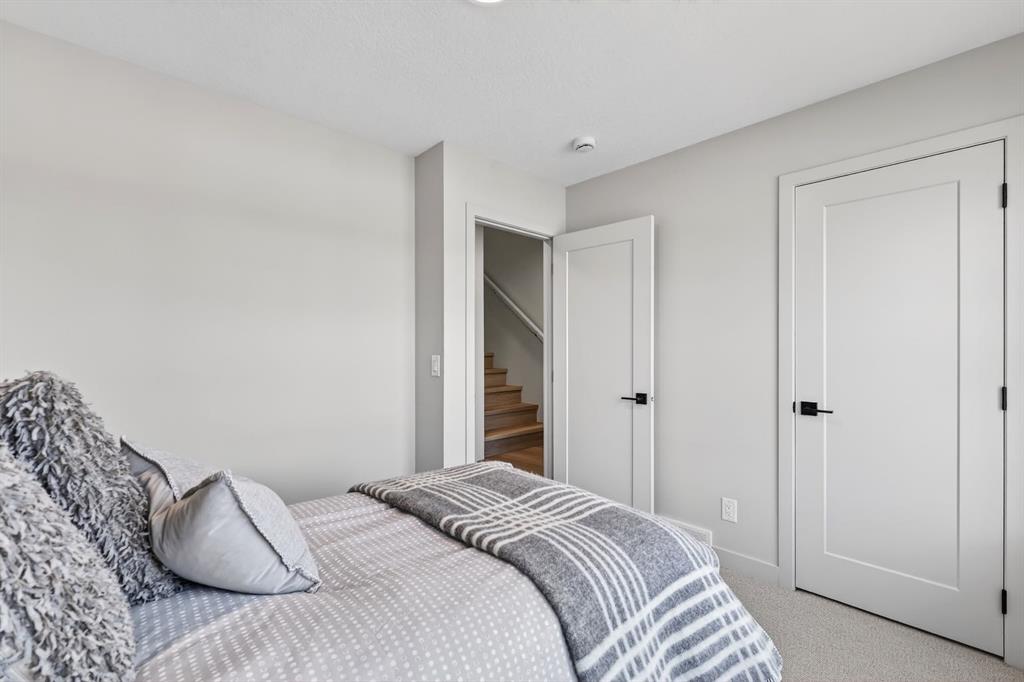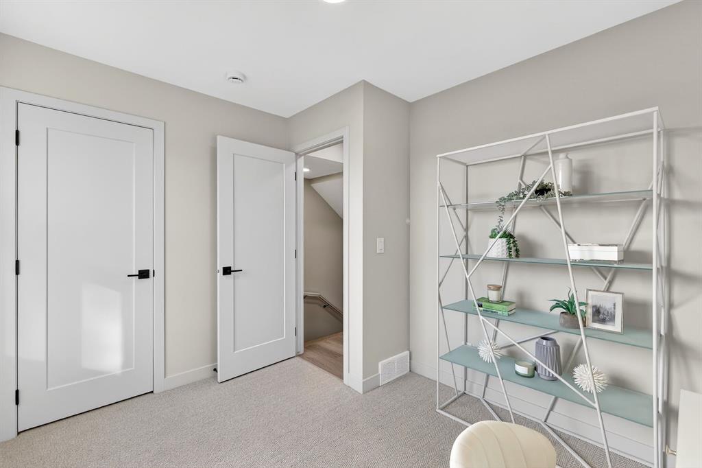 The second level is thoughtfully designed, featuring two bedrooms with walk-in closets, upper-floor laundry, and well-proportioned spaces that feel intuitive and livable. The third level is dedicated to a private primary retreat, where a lofted flex space, expansive walk-in closet, and spa-inspired ensuite come together to create a calm, elevated escape from the city below.