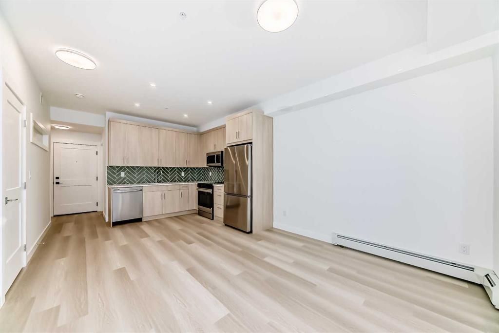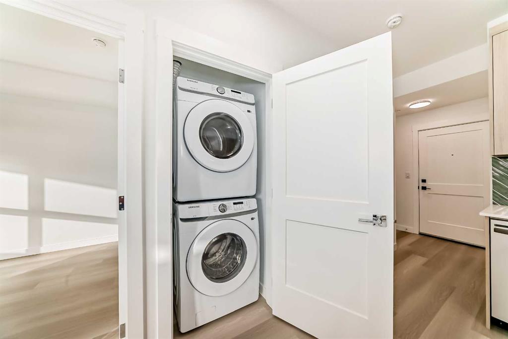 Welcome to the Curnoe 2 by Logel Homes—a well-designed unit featuring full-height cabinet fronts, quartz countertops, luxury vinyl plank flooring throughout, and tile in the bathroom. The upgraded kitchen includes a modern backsplash, a premium sink and faucet, and comes with stainless steel appliances. Enjoy year-round comfort with air conditioning, plus the convenience of an in-suite washer and dryer. Nine-foot ceilings and large windows provide plenty of natural light. This home includes a titled underground parking stall and is backed by the Alberta New Home Warranty. Located close to shopping, public transit, and major routes like Deerfoot and Stoney Trail, it offers easy access across the city. With affordable condominium fees, this is a great opportunity to own a well-appointed home in a convenient location. Quick Possession Available