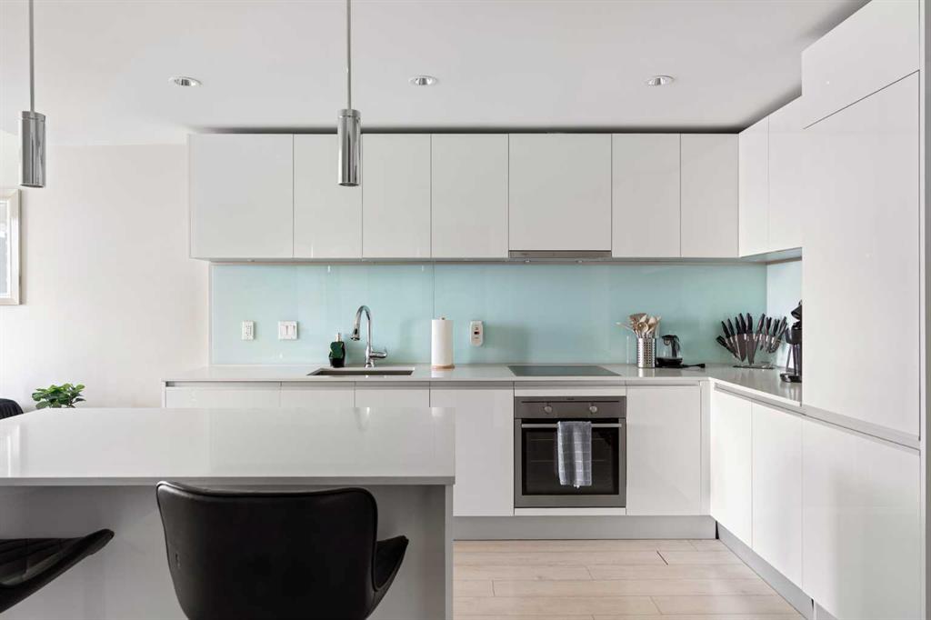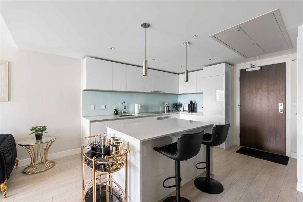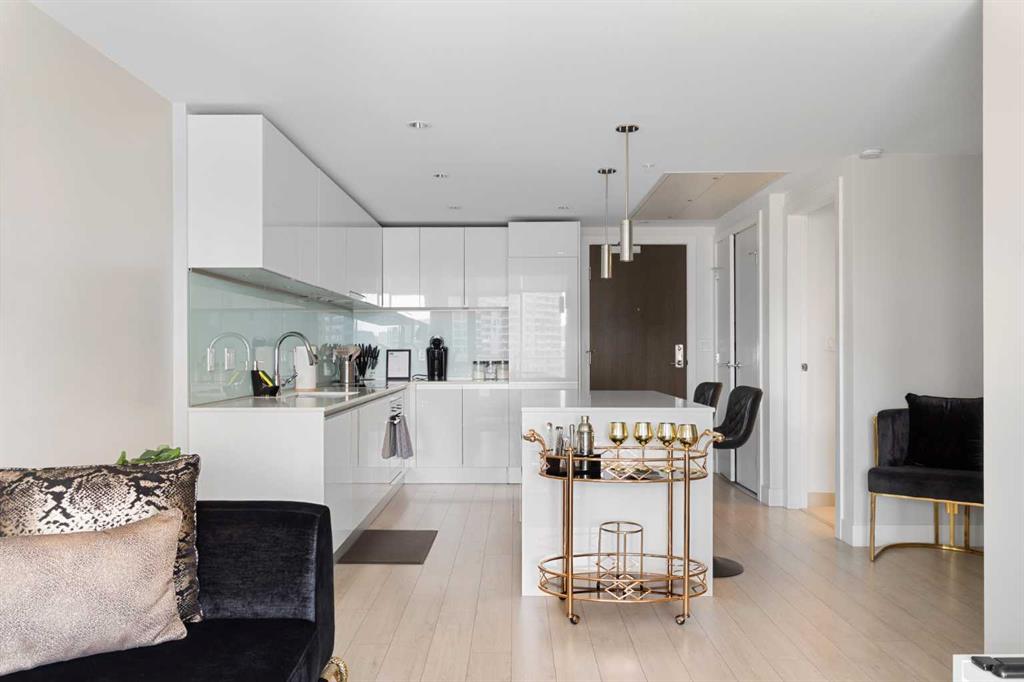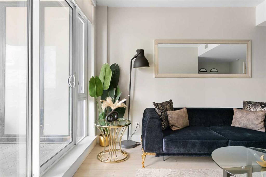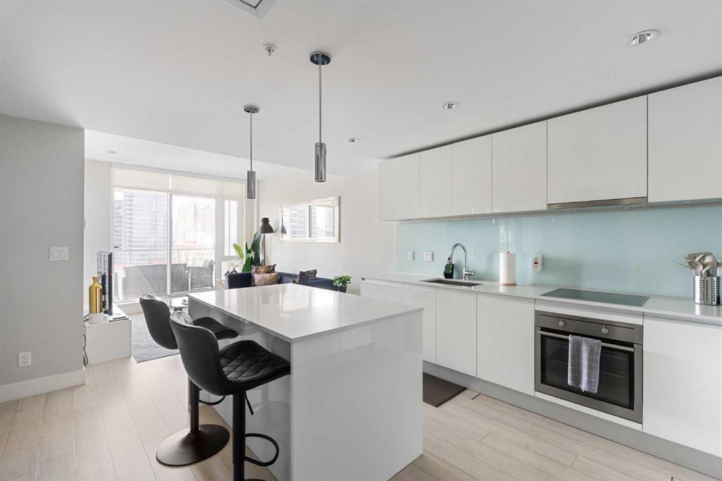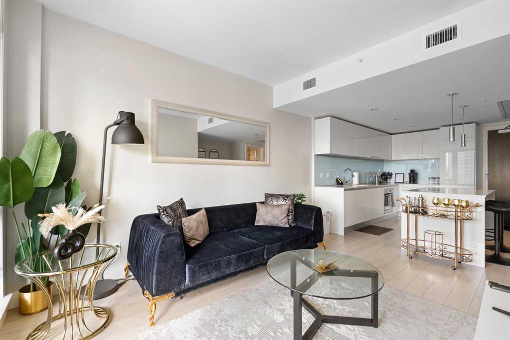 Enjoy upscale downtown living in this stylish 1-bedroom condo perched on the 8th floor of The Guardian, one of Calgary’s most recognizable residential towers. Showcasing west-facing skyline views through expansive floor-to-ceiling windows, this home blends contemporary design with functional comfort. The open-concept layout features a modern kitchen with a centre island, quartz countertops and sleek cabinetry, perfect for everything from quick meals to evening entertaining. The bright living room opens to a generous balcony, creating a seamless flow between indoor and outdoor space. The bedroom offers full-height windows, a walk-through closet and convenient access to the well-appointed 4-piece bathroom. Stay cool with central air conditioning, enjoy the ease of in-suite laundry, and benefit from titled underground parking. This secure, amenity-rich building includes 24-hour concierge service, a state-of-the-art fitness centre, yoga room, workshop, lounge with TVs and kitchen and a landscaped rooftop terrace with BBQs, fire tables, and panoramic views. Located in the heart of Calgary’s urban core, The Guardian puts you steps from the C-Train, Stampede Grounds, East Village, Repsol Centre, river pathways, and the restaurants, boutiques, and nightlife of 17th Avenue. Whether you're a professional, investor, or first-time buyer, this is your chance to own a sophisticated retreat in one of the city's most vibrant communities.