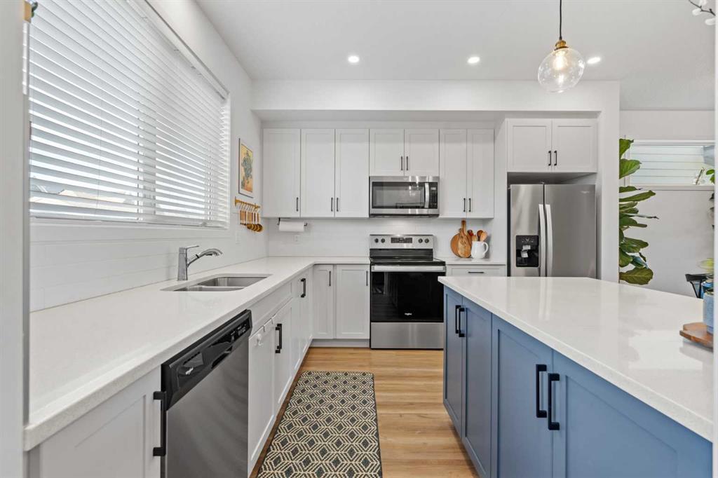 From the moment you arrive, you will appreciate the clean, contemporary exterior and low-maintenance landscaping that make everyday living easy. Step inside to a bright and functional main floor layout designed for both comfort and entertaining. A spacious foyer welcomes you in and flows seamlessly into the front living room, with the dining area perfectly positioned in the center of the home and the kitchen tucked at the rear. The kitchen showcases modern finishes, including dual-tone cabinetry, stainless steel appliances, and ample counter and storage space. Off to the side, you will find a thoughtfully updated mudroom and 2-piece bathroom, both renovated beyond builder-grade finishes to elevate the overall feel of the home.