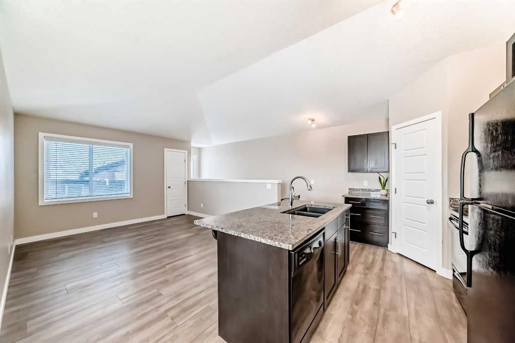 Welcome to your dream home! This immaculate Two Bedroom, Two Bathroom townhome offers a perfect blend of comfort and convenience, situated just steps from the beautiful Chinook Winds Park. Enjoy easy access to roadways and nature right outside your door. Step inside to discover a thoughtfully designed interior featuring a spacious living room with a striking pitched ceiling that enhances the sense of space and light. As an end unit with an abundance of windows, the home floods with natural light, creating a warm and inviting atmosphere. The open layout offers plenty of options for furniture placement, allowing you to create the perfect arrangement for your lifestyle.The expansive kitchen features espresso coloured cabinetry and elegant Granite countertops. Sleek black appliances and a central island with seating make this the perfect spot for casual dining or entertaining, while a large walk-in pantry provides ample storage for all your kitchen essentials. The kitchen flows into a sunny dining nook with access to the west-facing balcony, the perfect place to enjoy morning coffee, evening cocktails, or barbecuing with friends.