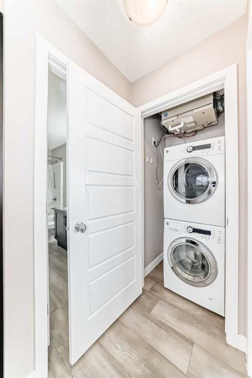 The large primary bedroom boasts a spacious walk-in closet and a luxurious 3-piece ensuite with a shower, providing a private retreat for relaxation. The sunny second bedroom, with windows on two walls, is ideal for a guest room or an inspiring home office. A convenient laundry closet with a washer and dryer is located in the hallway. This home also features in-floor heating, ensuring comfort during the colder months.With TWO easily accessible PARKING STALLS (one Titled and one Assigned), plus easy access to visitor and street parking nearby, convenience is at your fingertips. Location is key, and this townhouse doesn’t disappoint! It is ideally situated close to pathways, parks, ponds, schools, shopping, and amenities, making daily life a breeze.