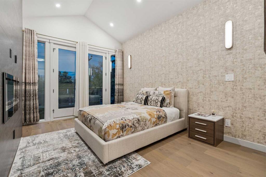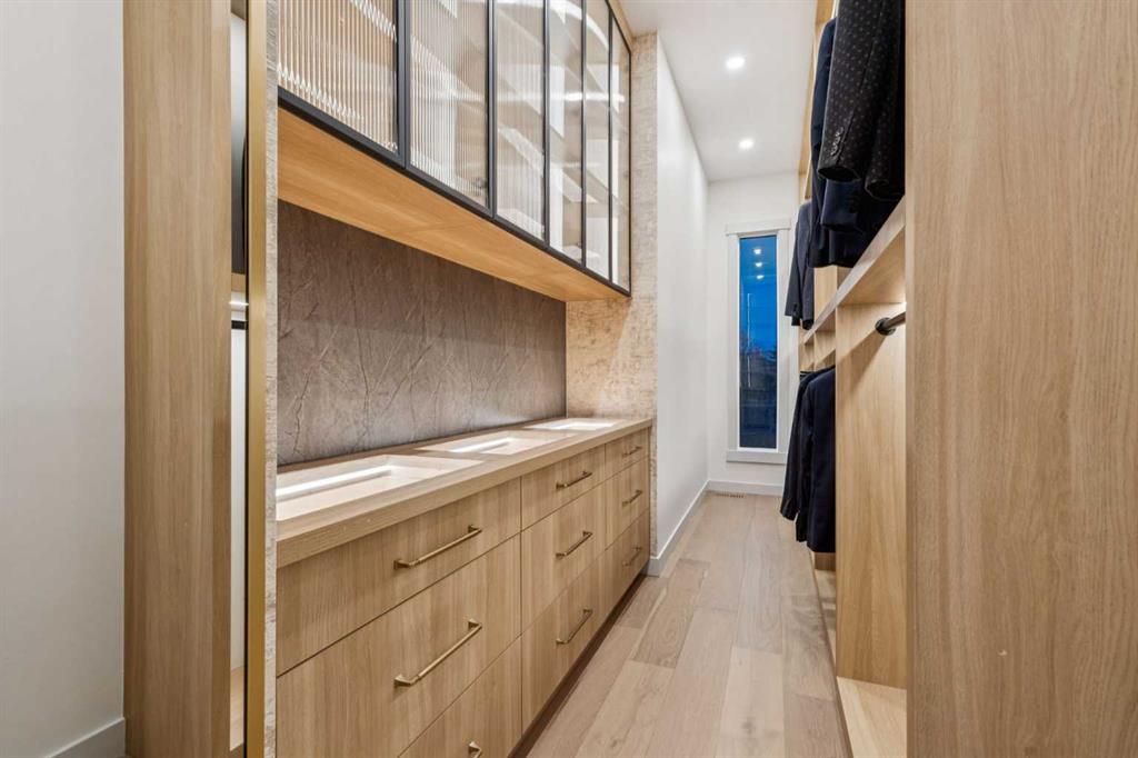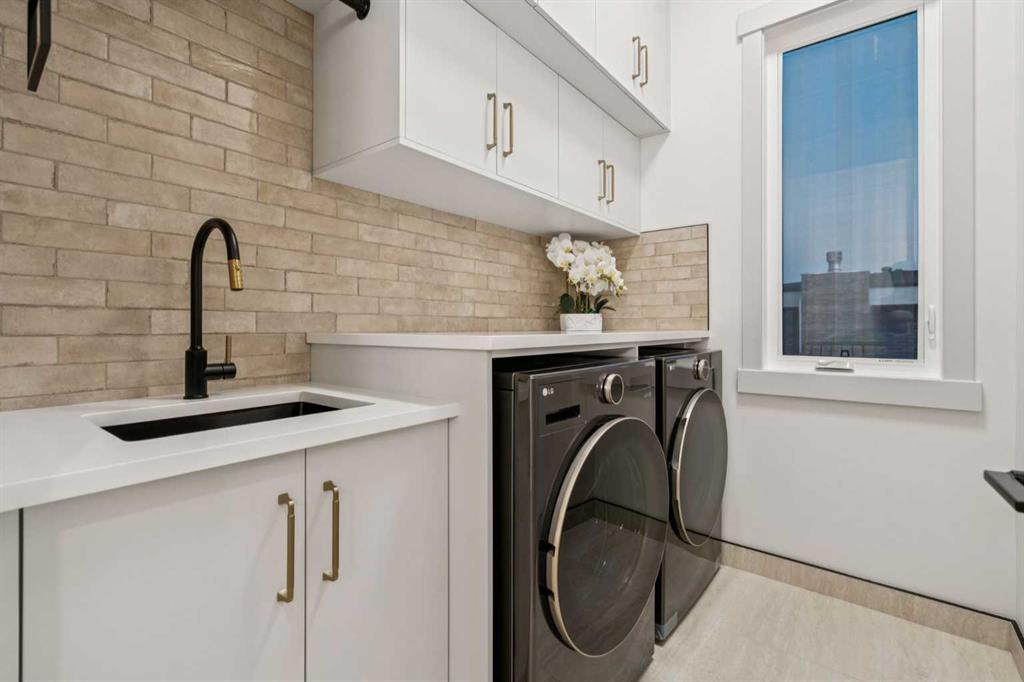 Upstairs, natural light floods the space through expansive windows. A flex/bonus area offers versatility for an office or reading nook. The primary retreat is a true sanctuary featuring a freestanding soaker tub, dual vanities, glass-enclosed steam shower with heated floors, and a custom walk-in closet with floor-to-ceiling built-ins, lighted glass drawers, and cupboards. Enjoy breathtaking views of the Bow River and nearby park — a rare find in urban living. Two additional bedrooms, each with their own 3-piece ensuite and custom walk-in closets, provide exceptional comfort and privacy. The laundry room with extra storage and sink adds convenience to the upper level.