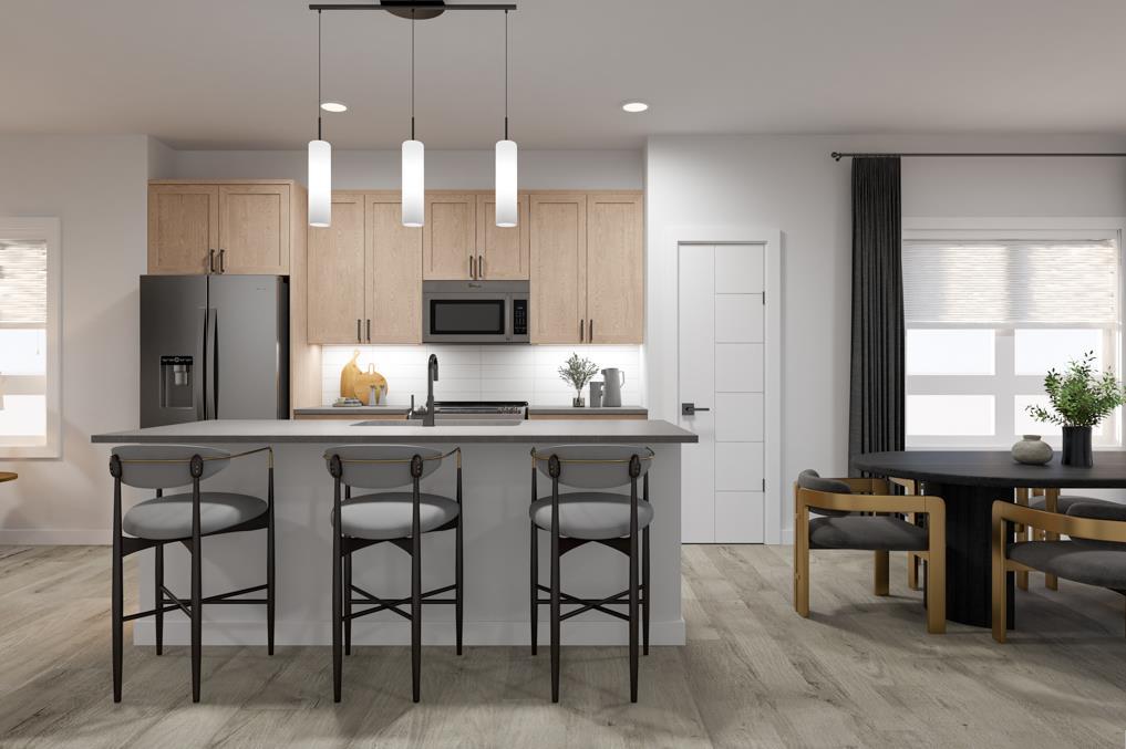 The main living level is organized with intention, not guesswork. The living room sits at the front of the home, anchored by END-UNIT WINDOWS that pull in EXTRA LIGHT and give the space real presence. The kitchen holds the centre, grounded by a BREAKFAST BAR ISLAND with space to prep, perch, eat, and linger, without turning the room into an obstacle course.