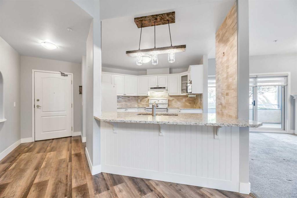 Welcome to this beautifully updated 2-bedroom plus den condo offering style, comfort, and convenience. The open floor plan is perfect for entertaining, featuring a bright living room with a cozy corner gas fireplace and access to the private balcony. The modern white kitchen boasts granite countertops and updated flooring, creating a fresh, contemporary feel throughout.