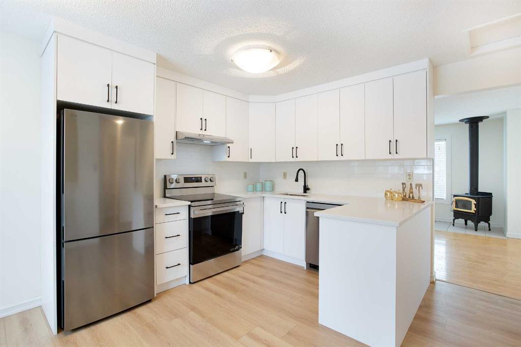 YOUR NEW HOME ... is in the highly desired Marda Loop, located on a quiet street but one block off of the main street with every conceivable eatery, pub, specialty boutiques and beauty services. This rare offering is a row design 4 plex, giving every owner front view access with your parking directly out of you back door. Open the front door and notice the durable hardwood floors, cozy fireplace and how incredibly bright it is. Walk into the kitchen and be in awe, its gorgeous, with 42 in custom cabinets, quartz counters, modern stacked tile backsplash, and worry free (under warranty), brand new stainless appliances and new vinyl plank flooring. Off to the side is your convenient newly renovated power room. Down 4 stairs and you will find your convenient mud room, with access to the parking stalls and each of the common , private, back yards. Back inside, down 4 stairs and you will find the laundry room, and maintenance room (furnace is 10 years old, HWT 5 years old) 2 generous, very bright bedrooms, 4 piece bathroom and lots of under the stairs storage. The exterior has been exceptionally well maintained and updated: roof 2016, windows 2013, east side fence 2024, yard work (hedge) 2020 new landings and steps 2021. Be the envy of all of your friends with a Marda Loop address and a beautiful home. I almost forgot to mention ... condo fees are only $200.00 a month! Hurry, this will sell fast.