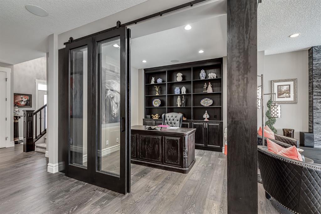 Thoughtful upgrades continue throughout the main floor: 8-foot doors, Heritage casings, knockdown ceilings, premium hardware, and a private den with custom glass barn doors — ideal for a home office or flex space.