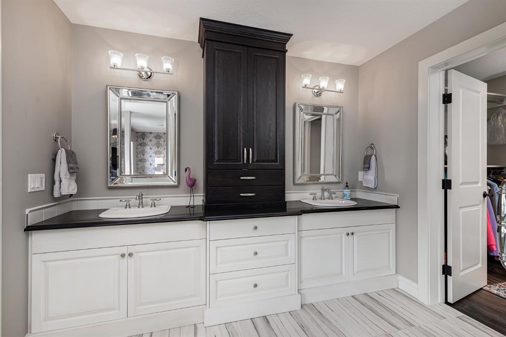 Upstairs, the home truly shines. The west-facing vaulted bonus room delivers height, light, and drama — perfect for movie nights, entertaining, or relaxing after a long day. The primary suite feels like a boutique hotel, complete with a spacious walk-in closet and a spa-inspired 5-piece ensuite featuring Kohler fixtures, dual sinks, a deep soaker tub, a fully tiled shower, and heated tile floors with a dedicated control unit. Two additional bedrooms, a full bath, and an upper-floor laundry room with added cabinetry round out the level.