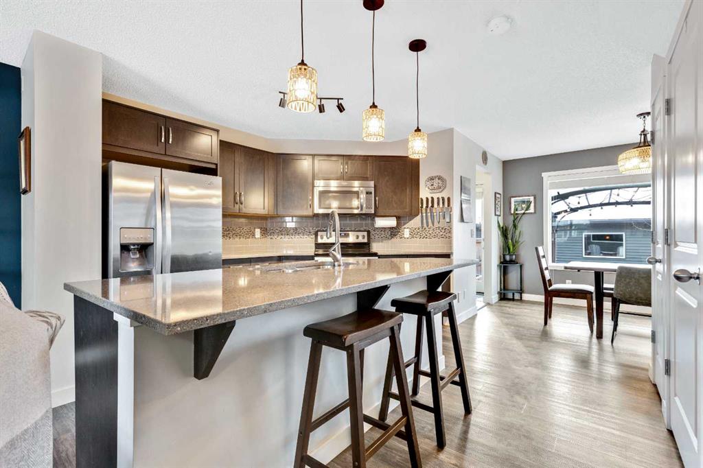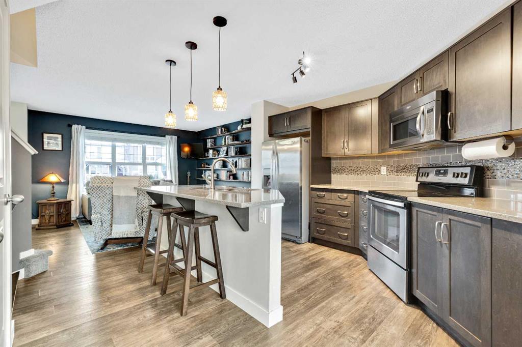 Bright and spacious end-unit townhome with NO CONDO FEES in the heart of Sunset Ridge, offering abundant natural light throughout the main living areas. The open-concept main floor features Bow Luxury Vinyl Plank and tile flooring, quartz countertops, and a large kitchen island with ample cabinet space, perfect for everyday living and entertaining. Step outside to the south-facing, fully fenced backyard with a gas line for BBQs and enjoy mountain views on clear days. Upstairs, the primary bedroom includes a walk-in closet and 4-piece ensuite, complemented by two additional bedrooms ideal for family, guests, or a home office. The basement is undeveloped with electrical completed and plumbing roughed in for a future bathroom, ready for your personal touch. Additional highlights include central air conditioning (2022) and an insulated, heated double detached garage. Located just one block from a K–8 school and close to Sunset Pond walking paths, this no-condo-fee home offers sunny, comfortable living in a highly desirable Cochrane location.