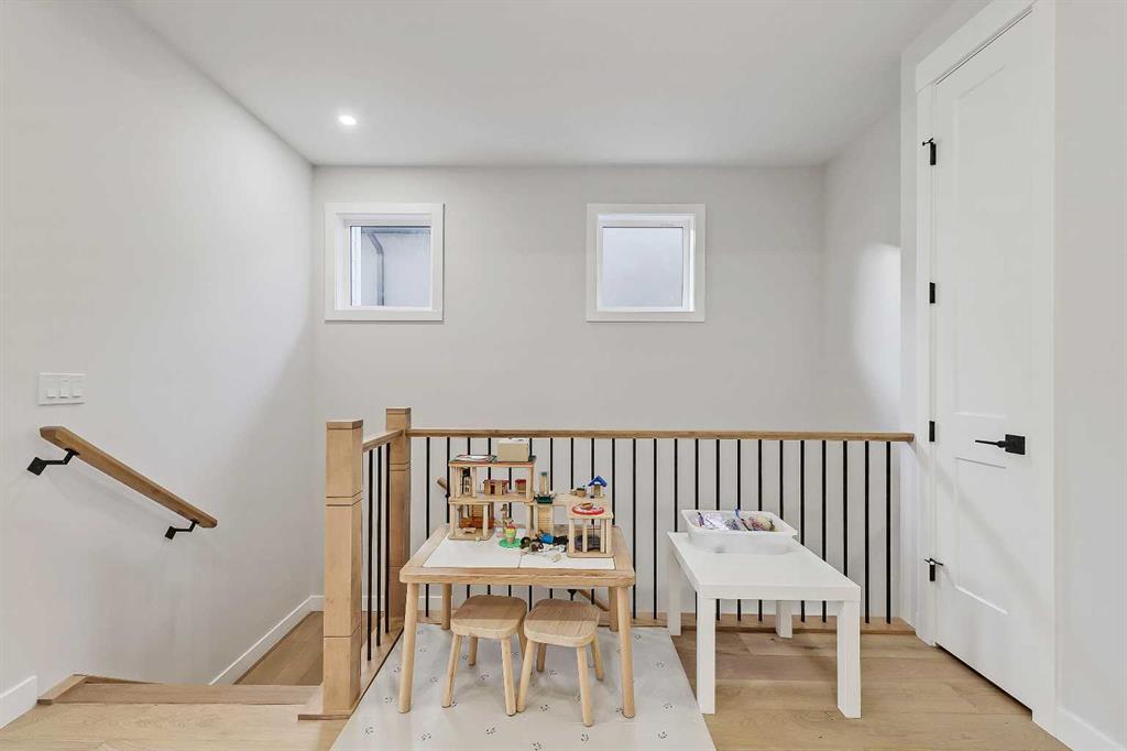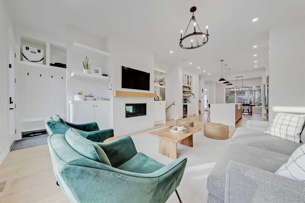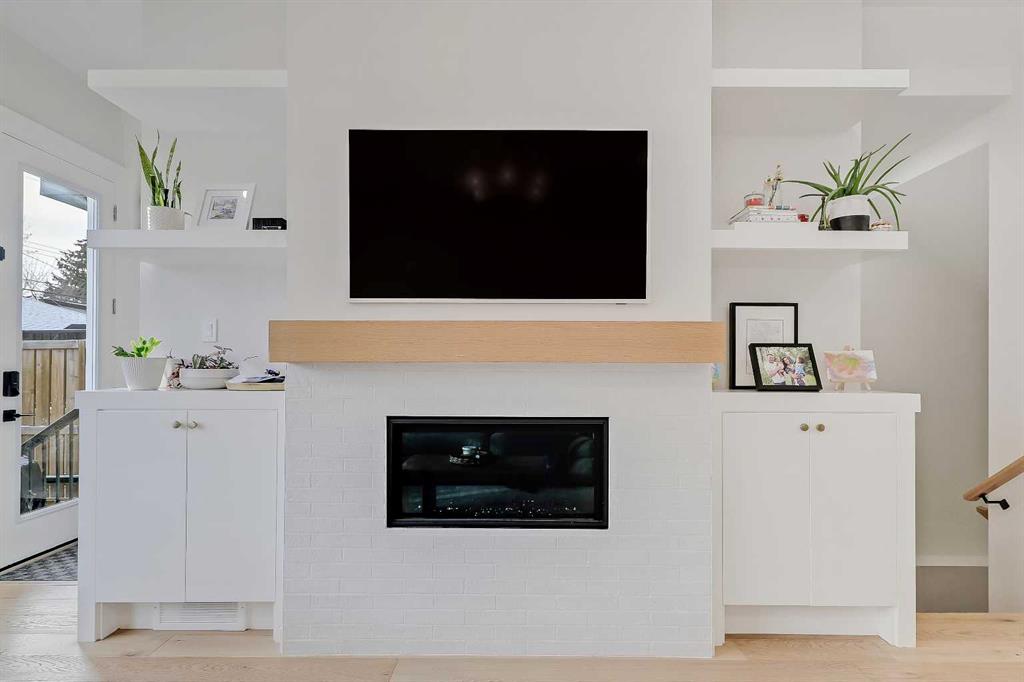 The main floor is flooded with natural light and finished with wide-plank hardwood flooring throughout. The living room is anchored by custom built-ins, wainscotting, electronic blinds, and a sleek gas fireplace, creating a warm and inviting focal point. The kitchen is a true showpiece, featuring full-height white cabinetry with oak accents, quartz countertops, premium stainless steel appliances, including an INDUCTION cooktop, INSTANT HOT WATER tap, and a large island with seating. A statement apron-front farmhouse sink adds both character and function, while open shelving and thoughtful storage keep the space feeling clean and intentional. The open dining area sits beside oversized windows overlooking the front yard, making the entire main floor feel bright, connected, and ideal for entertaining.