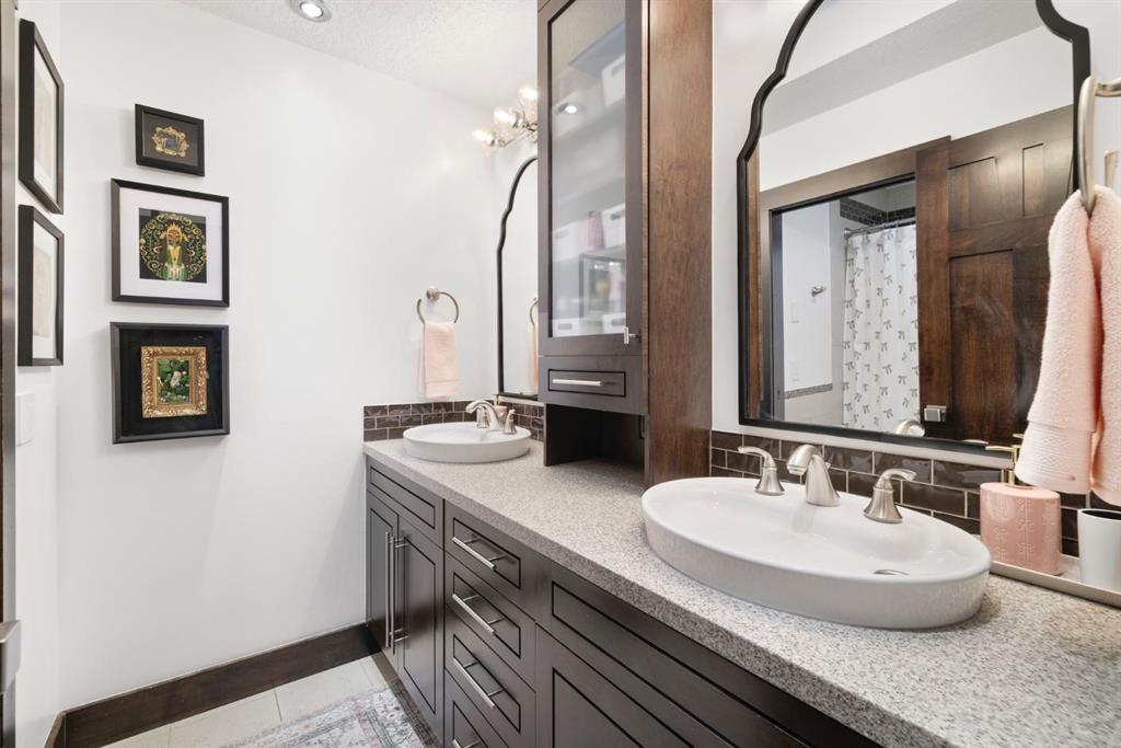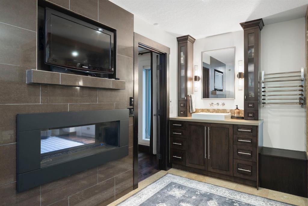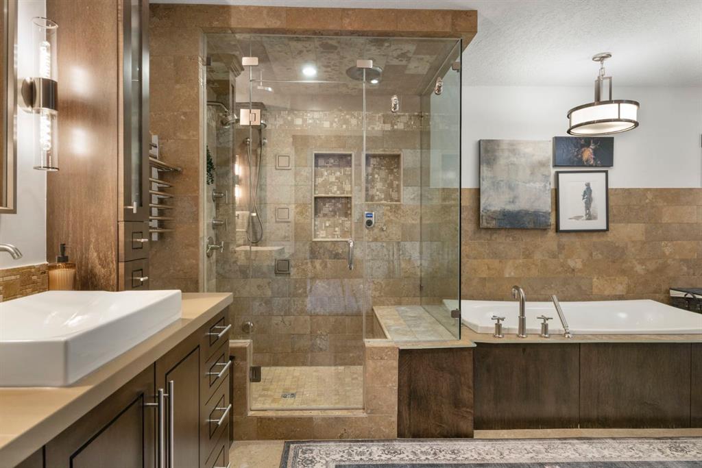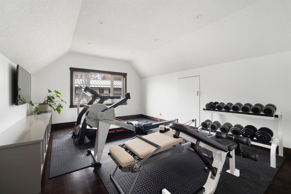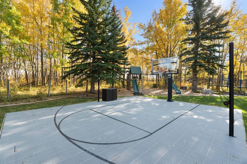 Upstairs, the primary retreat offers a 2-sided fireplace, steam shower with mood lighting and TV, heated floors, jetted tub, his and hers vanities, make-up station, and two redesigned walk-in closets including one with SUNDECK access and a very large second one with an office area. A newly updated kids’ wing has a play area complete with playhouse and 2 oversized bedrooms serviced by a 5-piece bath to complete the floor. The recently upgraded GYM area is spacious and ha an upscale feel with its leather flooring.The walkout level with two access doors, includes a state-of-the-art theatre with recessed seating and illuminated bar, a climate-controlled 104 sqft WINE CELLAR a new full bar with ice maker, dual fridges, dishwasher and microwave, a large recreation area, plus two additional bedrooms and 4-piece bathroom. Walk right out onto a full sports court, kid's playhouse, and aggregate and glass GREENHOUSE.