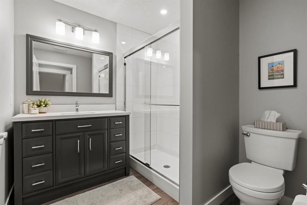 Located in the highly sought-after community of Mountview in Okotoks, where opportunities are rare due to limited supply, this beautifully built Sterling Home offers over 3,000 square feet of thoughtfully designed living space and is fully air conditioned for year-round comfort. The exterior makes a strong first impression with durable hardiboard front siding and a tasteful, timeless design. Inside, the home offers 2,268 square feet above grade with a fully finished basement, four bedrooms, a main floor office, and three and a half bathrooms, making it ideal for growing families or those who need flexible space. The main floor features gorgeous hardwood flooring, quartz countertops throughout, and stainless steel appliances. The kitchen is anchored by a large sit-up island with an integrated sink and flows seamlessly into the dining area and living room, where a beautiful fireplace and custom mantle create a warm and inviting focal point. A walk-through pantry connects the kitchen to the back entrance, complete with built-in coat hooks for everyday convenience. One of the standout features of this home is the heated screened room with retractable screens, allowing you to enjoy the outdoors comfortably through all seasons. Upstairs, the primary bedroom is filled with natural light from a stunning window and features a tasteful feature wall. The ensuite includes dual sinks with a quartz vanity, a soaker tub, a separate shower, and a large walk-in closet. Down the hall are two additional bedrooms and a well-designed laundry room with its own sink and excellent storage. At the end of the hall, the south-facing bonus room is flooded with light thanks to its abundance of windows, creating a bright and versatile family space. The fully finished basement includes a massive bedroom, a large open play or recreation area, and a full bathroom with a tiled shower extending to the ceiling. The mechanical room is equally impressive, featuring a recently serviced hot water tank and furnace, freshly cleaned ductwork, a full water softening system, an HRV system, and yes, air conditioning. Rounding out this exceptional home is the garage, which includes custom storage solutions and an epoxy-coated floor, creating a clean, functional, and truly standout space. Homes like this in Mountview do not come along often. This is a rare opportunity to secure a move-in-ready home in one of Okotoks’ most desirable communities.