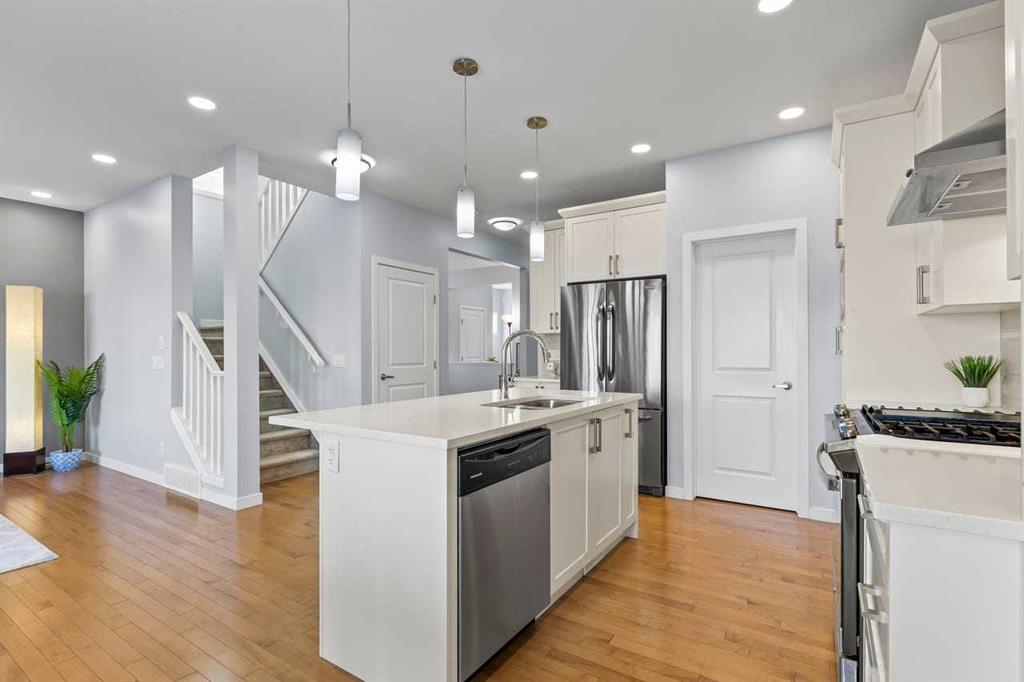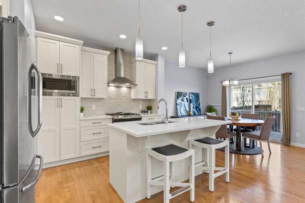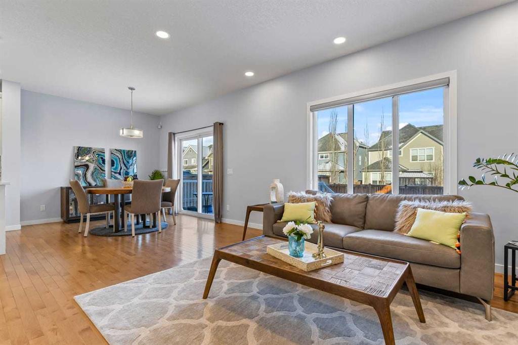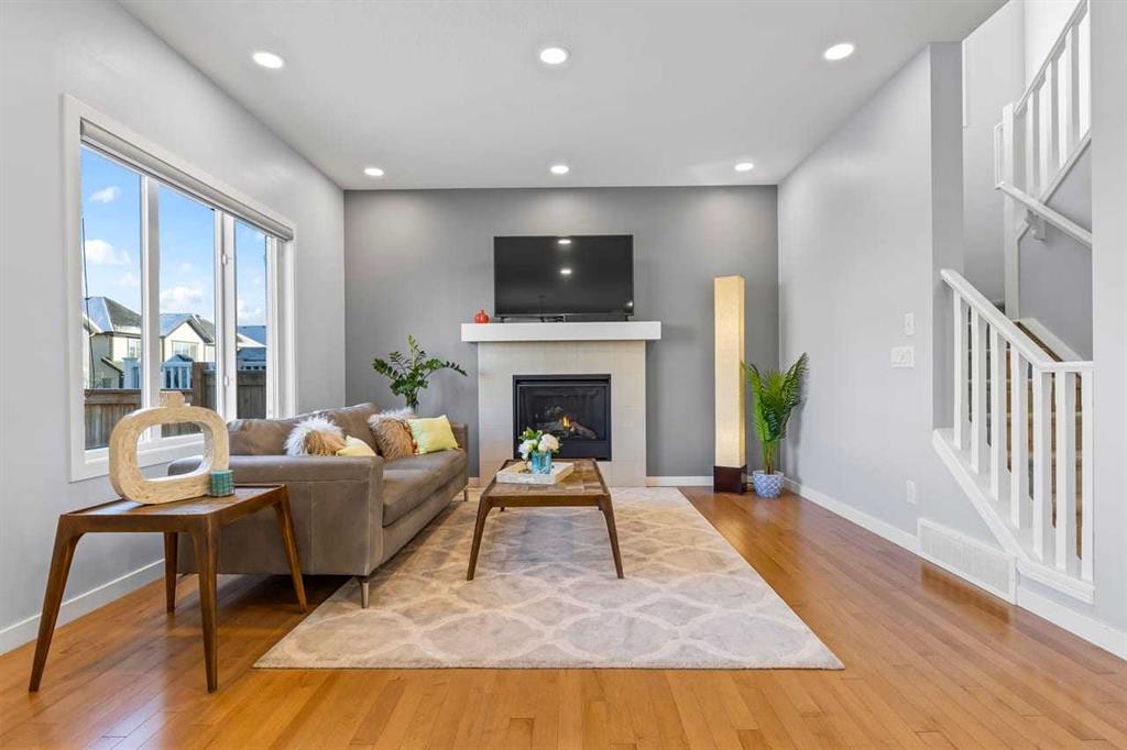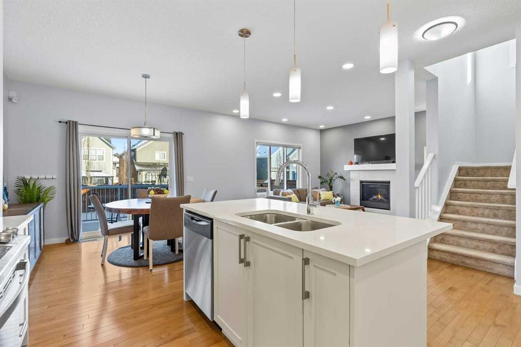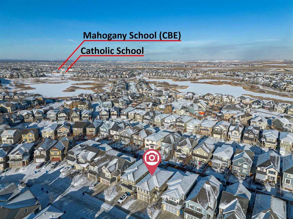 WELCOME TO THIS BRIGHT, BEAUTIFUL, THOUGHTFULLY DESIGNED 4 BEDROOM HOME located in the LAKE COMMUNITY OF MAHOGANY. This 4 bedroom, 2 1/2 bathroom home with DOUBLE ATTACHED GARAGE is situated in the coveted lake community of Mahogany. WELL MAINTAINED, it offers a welcoming OPEN CONCEPT MAIN FLOOR with a CONVENIENT DEN, ideal for work-from-home needs or a quiet study. Large windows flood the living spaces with natural light, while a cozy gas fireplace and stylish pot lights create an inviting ambiance. The main floor blends hardwood and tile with a modern aesthetic, featuring a chef’s kitchen that will delight any home cook.
