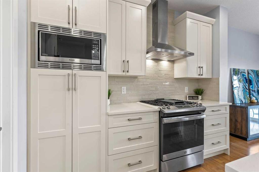Cook and entertain in style with a bright kitchen that includes a WALK-IN PANTRY, a CENTRAL ISLAND, QUARTZ COUNTERTOPS, and STAINLESS STEEL APPLIANCES, including a GAS RANGE, HOOD FAN, and a BUILT-IN MICROWAVE. WHITE CABINETS paired with a STONE BACKSPLASH provide a timeless, high-end finish.