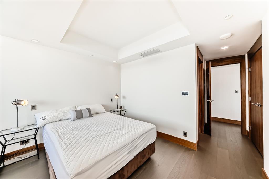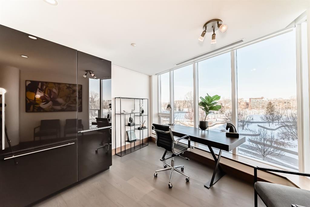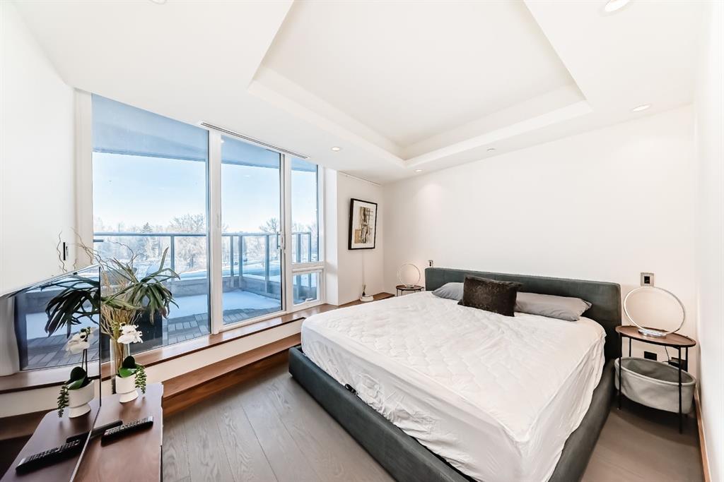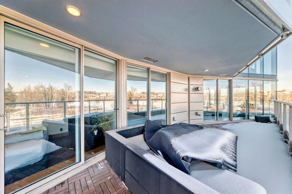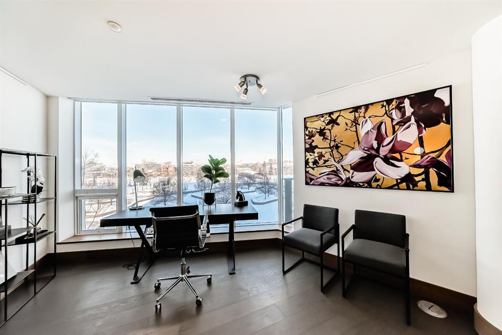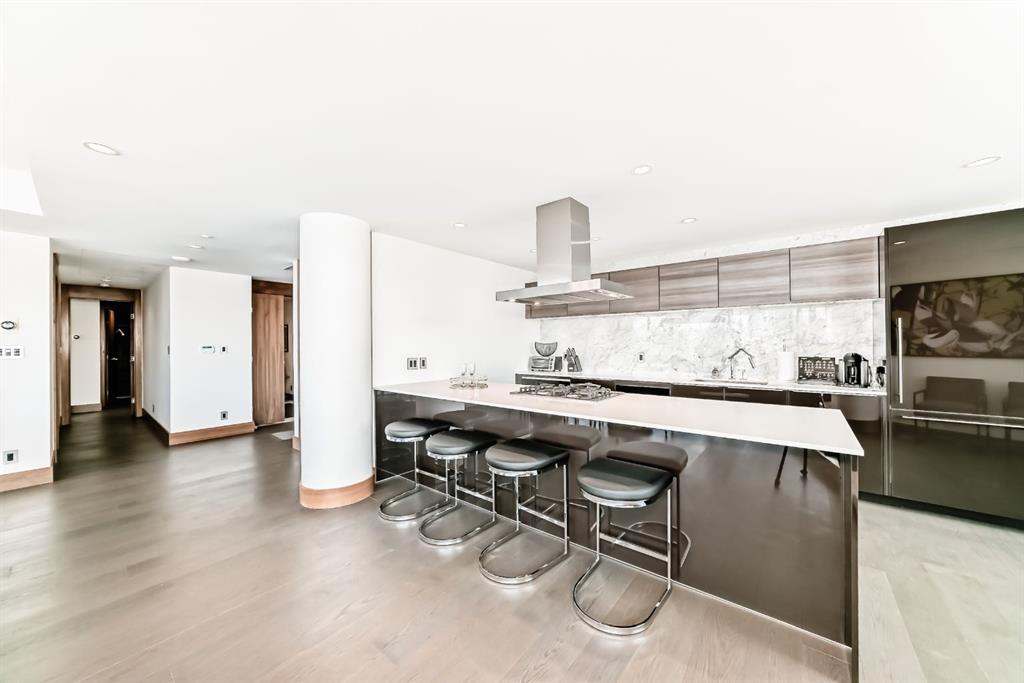 Experience elevated riverfront living in this exceptional original-owner residence at The Concord, ideally situated across from Calgary’s iconic Peace Bridge in prestigious Eau Claire. Offering nearly 2,000 sq. ft. of refined interior space with unobstructed NW and E river views through floor-to-ceiling windows, this luxurious suite features private elevator access to your exclusive foyer, an expansive open-concept layout, hardwood flooring, marble finishes, walnut accents, LED lighting, built-in speakers, heated bathroom floors, and full Control4 automation. The designer Poggenpohl kitchen is equipped with white stone countertops, a large island with seating for four, and premium Miele appliances including a gas cooktop, built-in refrigerator, and wine fridge, seamlessly connecting to the formal dining area and spacious living room with gas fireplace and access to two private balconies. The primary retreat offers balcony access, a custom walk-in closet, and a spa-inspired 5-piece ensuite with dual vanities, marble and glass shower, heated floors, and jetted soaker tub, while the second bedroom also features balcony access and a private 4-piece ensuite with heated flooring. Additional highlights include a separate laundry room, Level 2 EV charging, an oversized private garage, and one of the largest storage units in the building. Residents enjoy 24-hour concierge service, heated underground guest parking, car wash bay with undercarriage wash, fitness centre, elegant party room, and a beautifully landscaped patio with BBQ area overlooking a serene pond that transforms into a winter skating rink—an extraordinary opportunity to own in one of Calgary’s most prestigious addresses.
