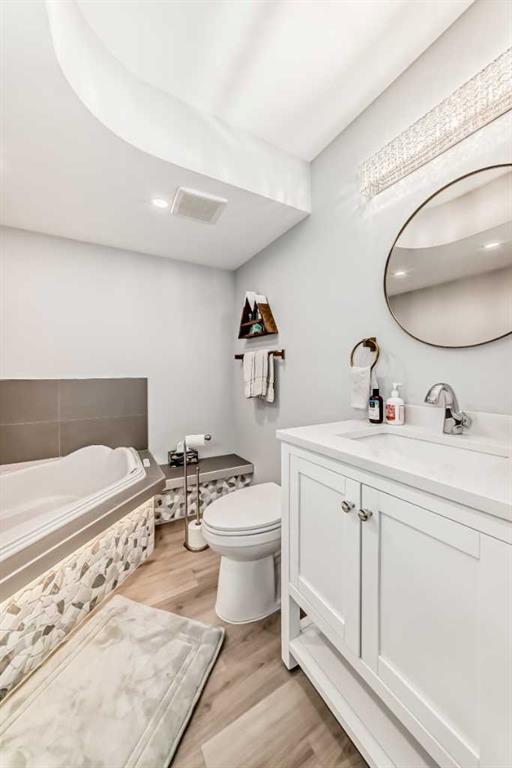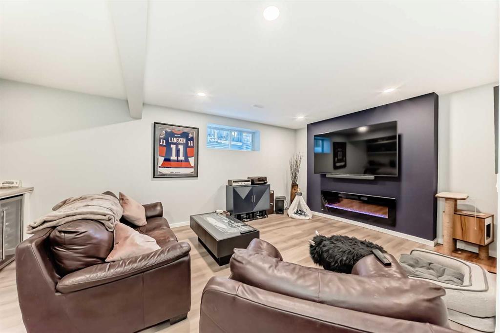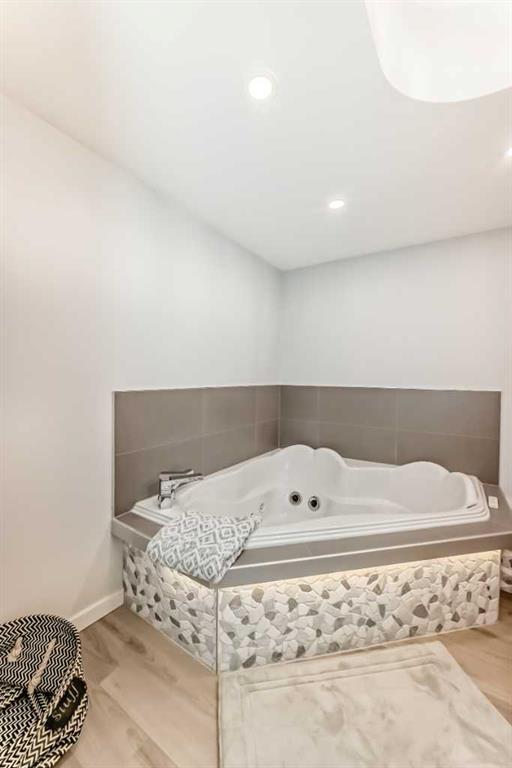 The fully finished basement (2022) is designed for entertaining, featuring a wet bar, theatre space, and a twin jacuzzi tub—ideal for movie nights, hosting guests, or relaxing at home.