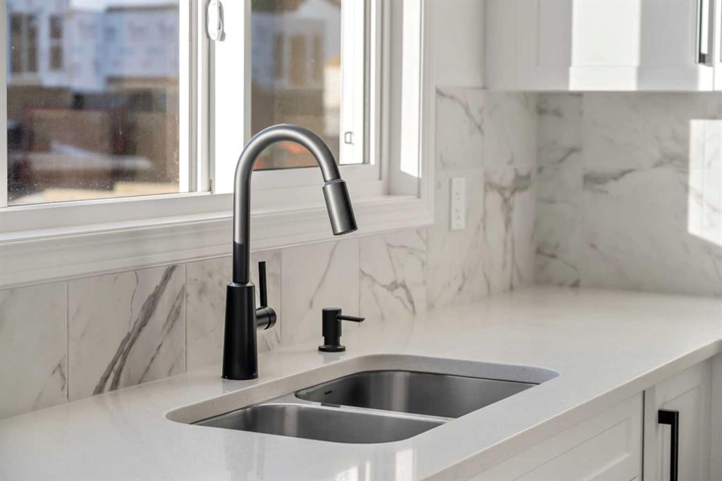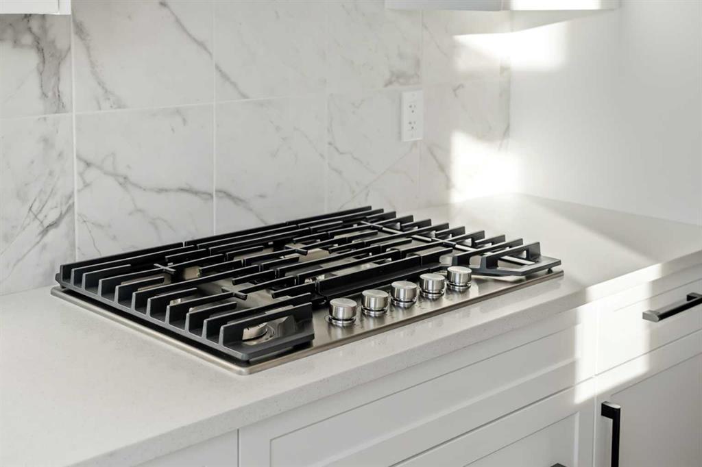 The main floor features an open and inviting layout enhanced by 9’ knock-down ceilings, creating a bright and spacious feel throughout. The extended kitchen option provides ample workspace and storage, finished with granite countertops, built-in stainless steel appliances, and a pull-out kitchen faucet with spray for added convenience. The kitchen flows seamlessly into the dining and living areas, making it ideal for everyday living and hosting. Access to the rear deck with stairs to grade extends the living space outdoors and offers easy backyard access.