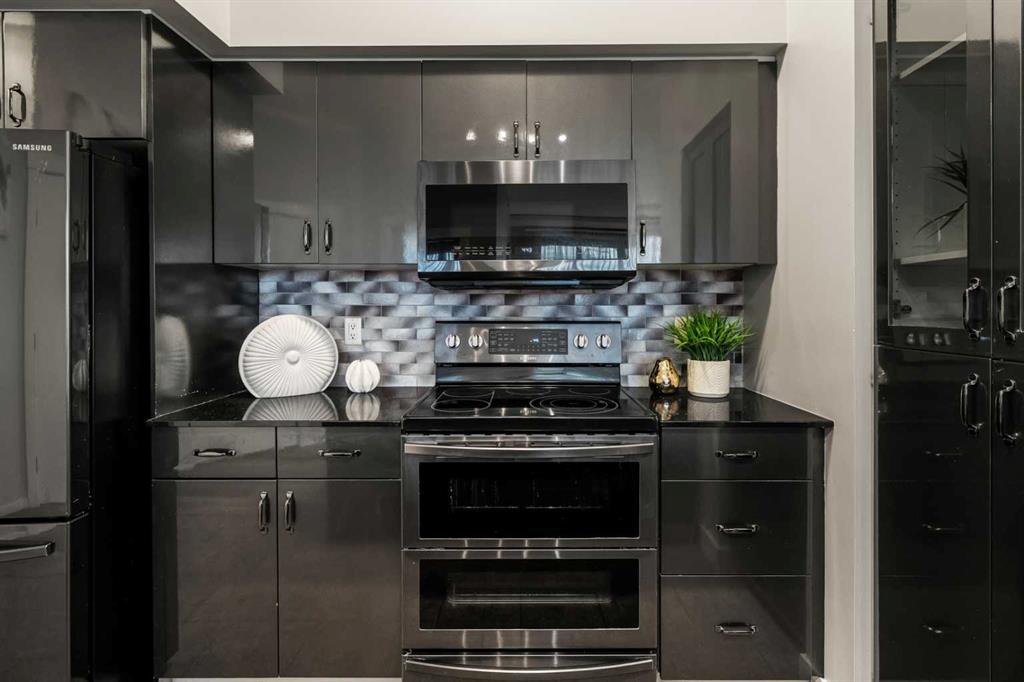 The kitchen has been thoughtfully updated with Newer gunmetal black appliances (all replaced within the last 3–4 years), including an electric stove with double oven option, refrigerator, microwave hood fan, and dishwasher. The cabinets have been updated with double coat of paint and new hardware in the kitchen and in both bathrooms. Beautiful gold-flecked black granite countertops, a tile backsplash, and a double sink complete the space, making it as functional as it is striking. A new designer dining room light fixture adds a touch of elegance to the adjoining dining area that is more house sized than a typical condo perfect for family dinners or entertaining. Comfort and style continue throughout the home with automatic blinds in the bedrooms and dining room, custom drapery on all windows, new entry and primary closet doors, and additional storage above the closets in both the primary bedroom and front entry. The front entry allows for a desk space if desired or a added space for you favorite shoe collections. The living room has lots of light and lots of space for big sectionals and a large TV if desired. The primary bedroom has room for a king sized bed, lost of extra storage added above a large closet, with a lovely 4 pc ensuite. With the other bedroom on the opposite side of the unit its spacious giving everyone occupant privacy. The unit also includes a stacked washer and dryer and a tankless hot water system for added efficiency.