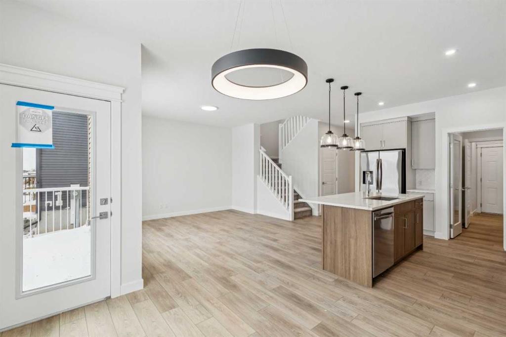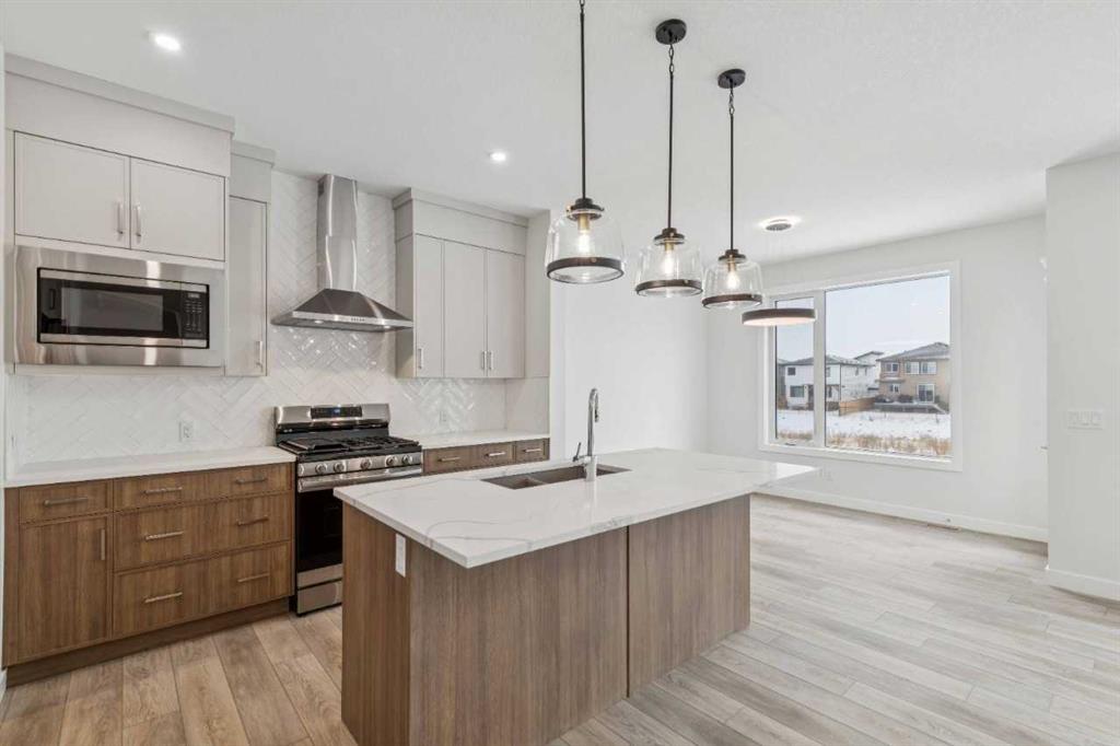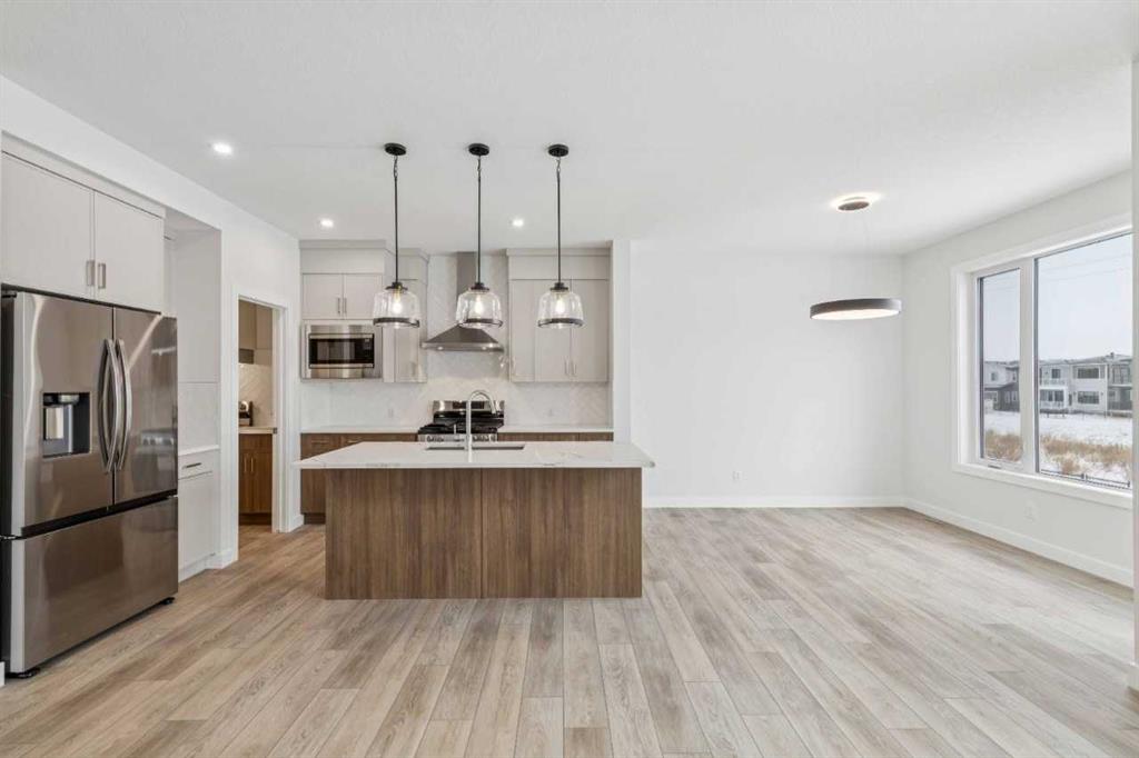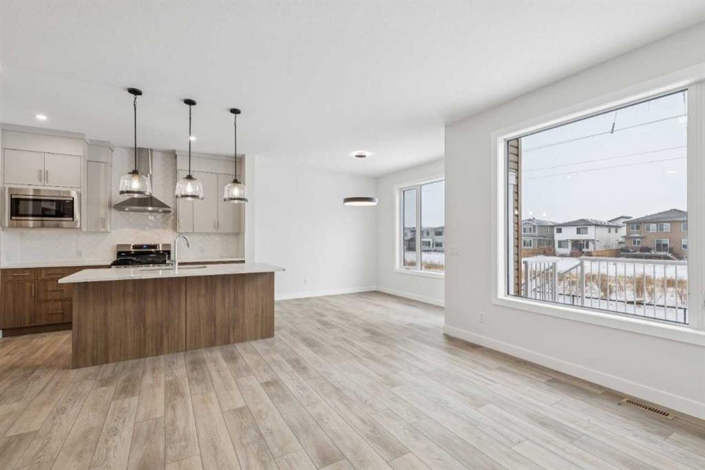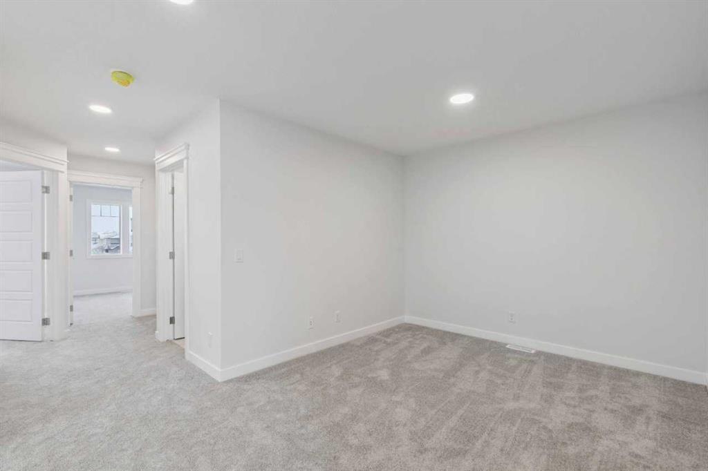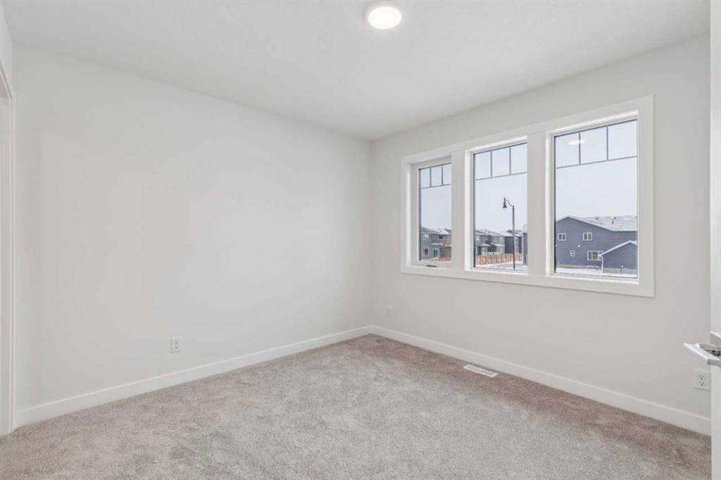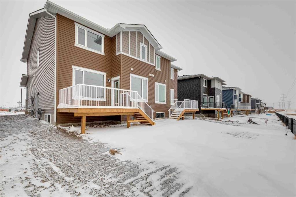 Welcome to The Mitchell by NuVista Homes, located at 257 Dawson Wharf Road in the desirable community of Dawson’s Landing, Chestermere. This thoughtfully designed 1,874 sq ft home offers 3 bedrooms and 2.5 bathrooms with a functional layout ideal for modern family living. The main floor features 9’ foundation and ceiling heights, luxury vinyl plank flooring, a flex room, and a bright great room that flows into a well-appointed kitchen with quartz countertops, taller upper cabinets, and a dedicated spice kitchen. Both the mudroom and front foyer include built-in benches for added everyday convenience. Upstairs, the primary bedroom includes a walk-in closet and private ensuite, complemented by two additional bedrooms, a full bathroom, a media room, and upper-floor laundry. A side entrance provides excellent future basement development potential, while the 12’ x 10’ rear deck is perfect for summer enjoyment.