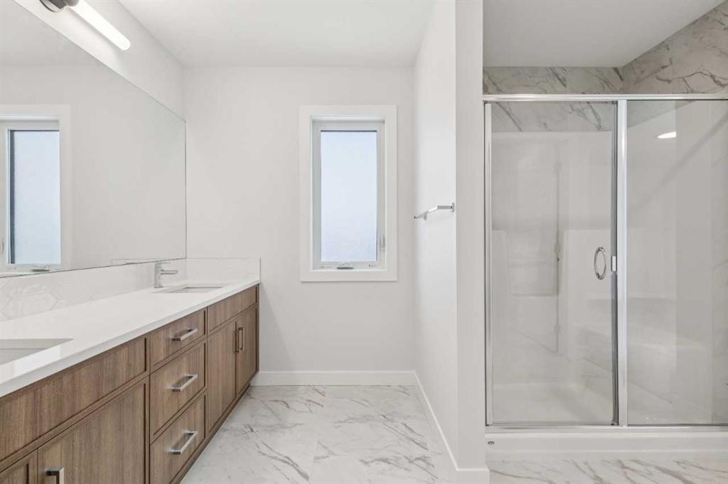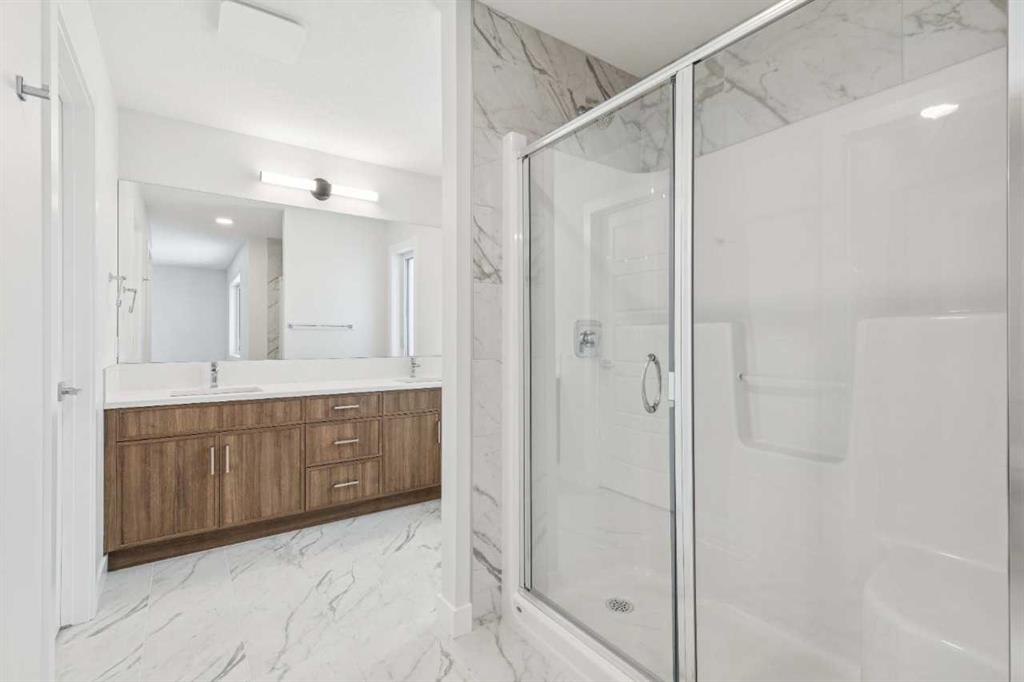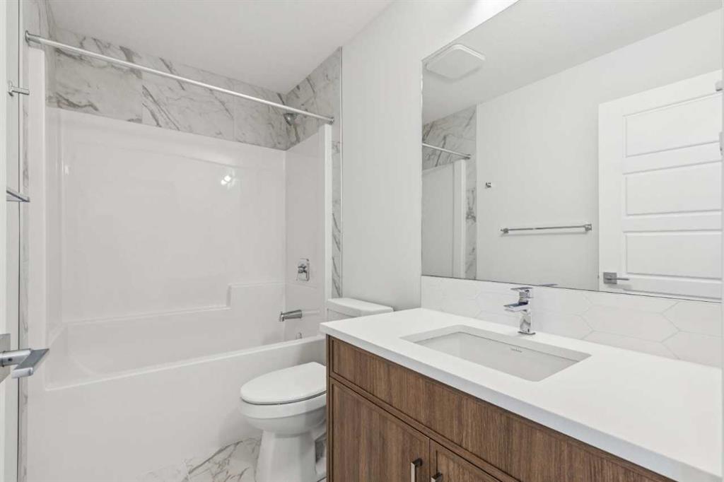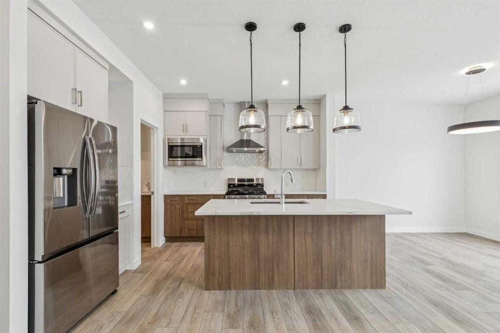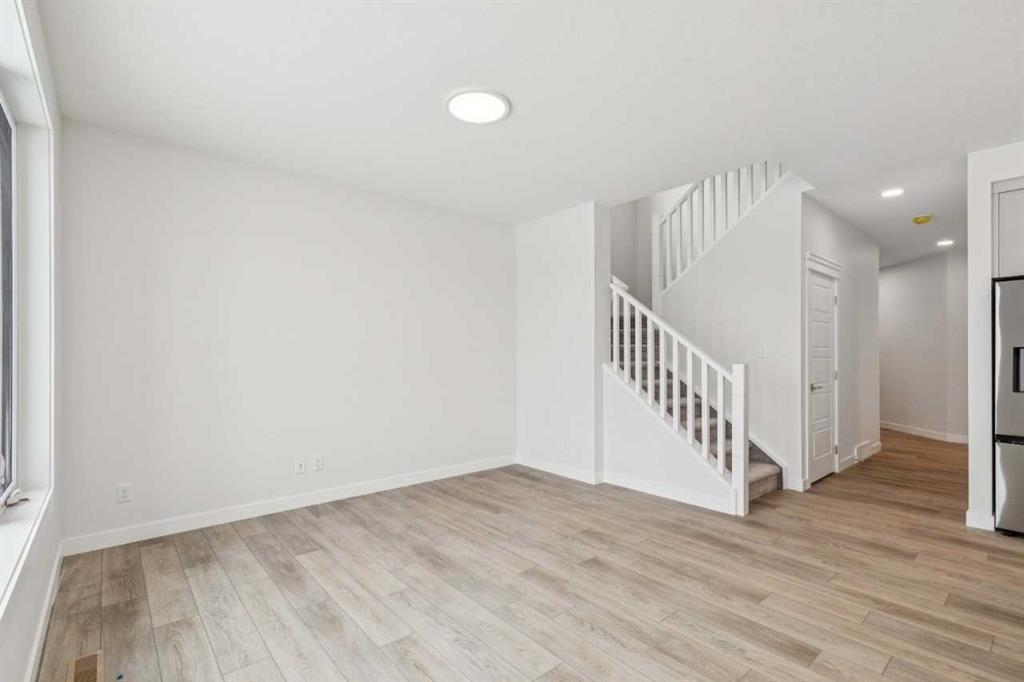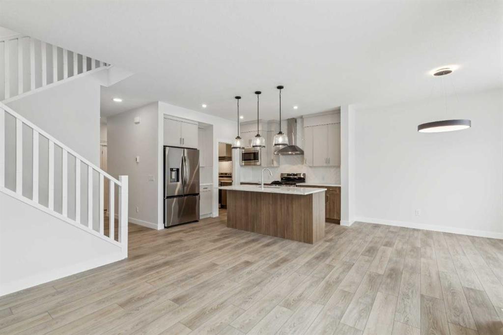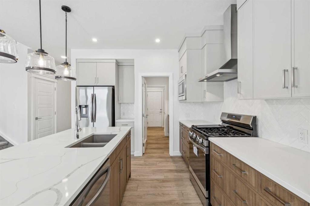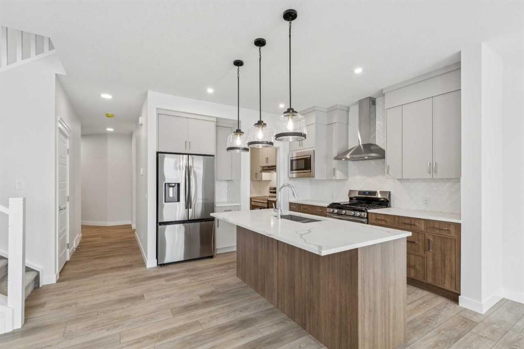 Welcome to The Mitchell by NuVista Homes, located at 257 Dawson Wharf Road in the desirable community of Dawson’s Landing, Chestermere. This thoughtfully designed 1,874 sq ft home offers 3 bedrooms and 2.5 bathrooms with a functional layout ideal for modern family living. The main floor features 9’ foundation and ceiling heights, luxury vinyl plank flooring, a flex room, and a bright great room that flows into a well-appointed kitchen with quartz countertops, taller upper cabinets, and a dedicated spice kitchen. Both the mudroom and front foyer include built-in benches for added everyday convenience. Upstairs, the primary bedroom includes a walk-in closet and private ensuite, complemented by two additional bedrooms, a full bathroom, a media room, and upper-floor laundry. A side entrance provides excellent future basement development potential, while the 12’ x 10’ rear deck is perfect for summer enjoyment.