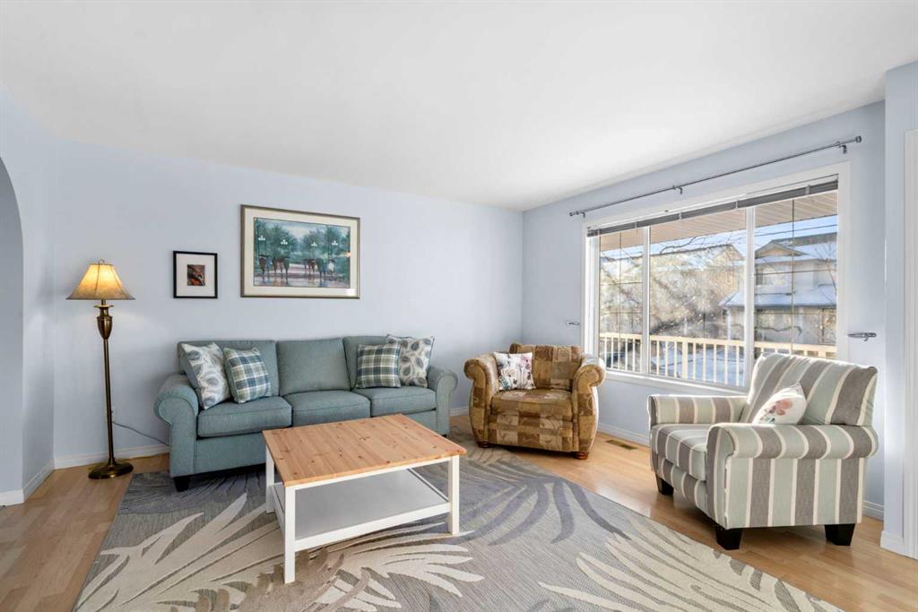The open-concept main floor is filled with natural light thanks to large south-facing windows, creating a warm and welcoming atmosphere. Durable laminate flooring flows through the living space, leading into a clean, timeless kitchen with white cabinetry, stainless steel appliances, and a versatile island — ideal for everyday living or casual entertaining. The adjacent dining area opens directly to the patio and backyard, making indoor-outdoor living effortless.