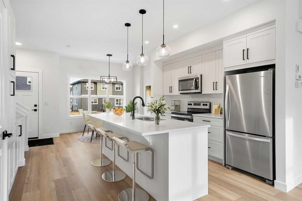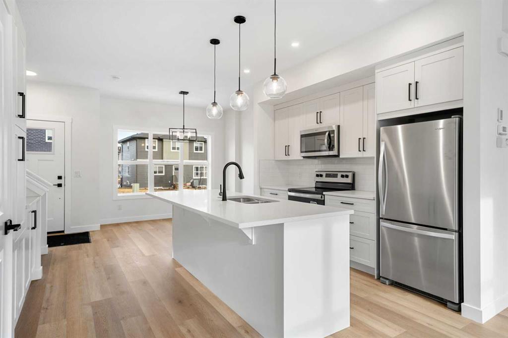 Welcome to the newly built #804, 525 River Heights Drive. This townhome features a HUGE SOUTH-FACING FENCED BACKYARD that offers the feel of a single-family yard. Inside, the main floor is bright and open, with a modern layout designed for both style and function. This unit backs onto a WALKING PATH AND GREENSPACE! At the heart of the home is a SLEEK CONTEMPORARY KITCHEN with QUARTZ COUNTERTOPS, MATTE BLACK HARDWARE, WHIRLPOOL STAINLESS STEEL APPLIANCES, SOFT-CLOSE CABINETRY, and a CENTRAL ISLAND WITH SEATING, ideal for casual dining or entertaining. The kitchen flows seamlessly into the dining and living areas, where LARGE WINDOWS and LUXURY FLOORING create a welcoming atmosphere. A powder room and a DEDICATED MUDROOM off the back entrance add practicality to everyday living. Upstairs, the primary bedroom includes a WALK-IN CLOSET and a PRIVATE THREE-PIECE ENSUITE. Two additional bedrooms provide versatile space for children, guests, or a home office. A four-piece bathroom and a CENTRALLY LOCATED LAUNDRY area complete the upper floor with added convenience. The unfinished basement offers potential for future development, extra storage, or a layout tailored to your needs. Energy-efficient features such as DUAL-PANE windows, a HIGH-EFFICIENCY HVAC system, and an HRV unit support year-round comfort. Outdoors, you can relax in your FULLY FENCED BACKYARD with a REAR PATIO or enjoy a quiet morning on the COVERED FRONT PORCH. 2 PARKING STALLS are INCLUDED, and with LANDSCAPING and SNOW REMOVAL taken care of, this property is truly low maintenance. Situated in the well-established community of RIVERSONG, you are close to schools, parks, walking paths, CO-OP and the Spray Lake Sawmills Family Sports Centre. Quick access to Highway 1 and 22 makes both Calgary and the mountains easy to reach. With quality finishes, a thoughtful design, and a vibrant neighbourhood, this home offers comfort and convenience in equal measure. Please note that photos are taken from the showhome and may not reflect this property, as it is still under construction. CONTACT TO VIEW THE FREESTONE SHOWHOME at 525 RIVER HEIGHTS DRIVE – OPEN WEEKENDS 12 – 5pm! One or more photo(s) was virtually staged to help viewers visualize the home’s appearance once construction is fully completed.