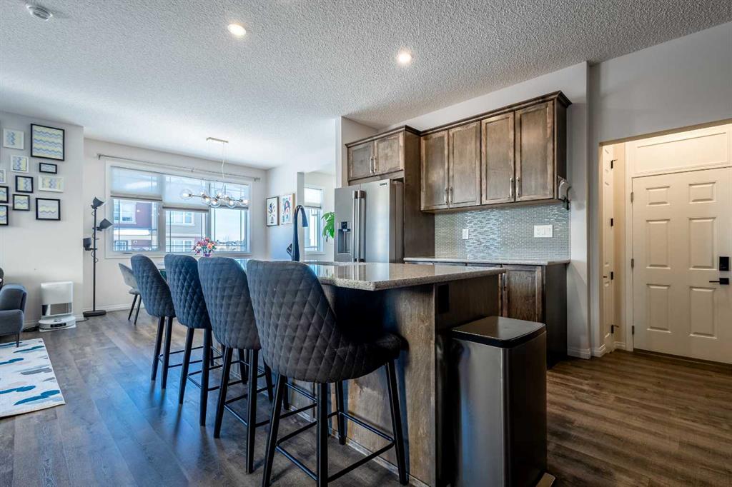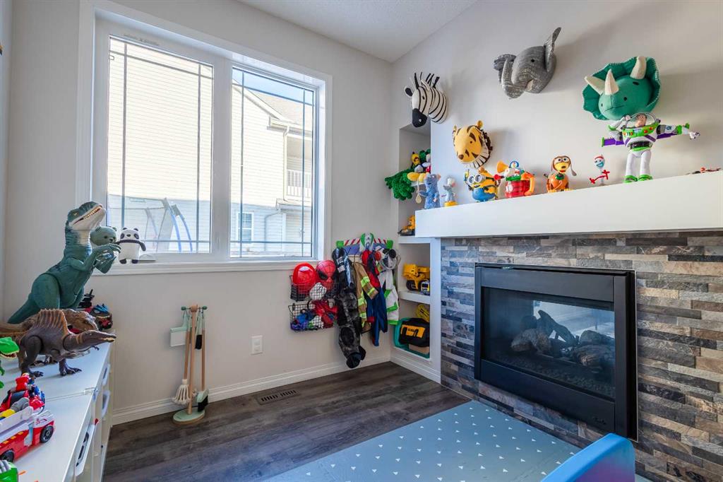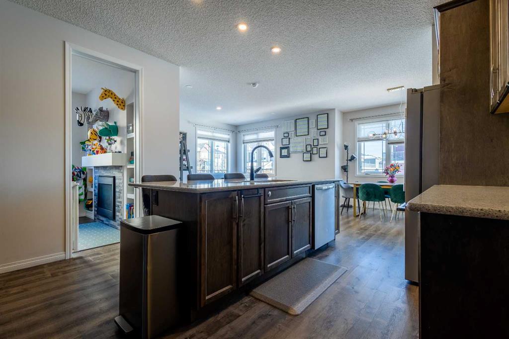 A spacious foyer opens to luxury vinyl plank flooring that runs throughout the main level. The kitchen is both stylish and practical, offering expansive quartz countertops, stainless steel appliances, and generous cabinetry—ideal for daily living and entertaining. The oversized dining area flows seamlessly into the open-concept living space, where a dual-sided gas fireplace adds warmth and definition. Large glass doors lead to a fully fenced backyard and deck, extending the living space outdoors.