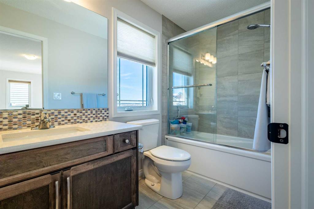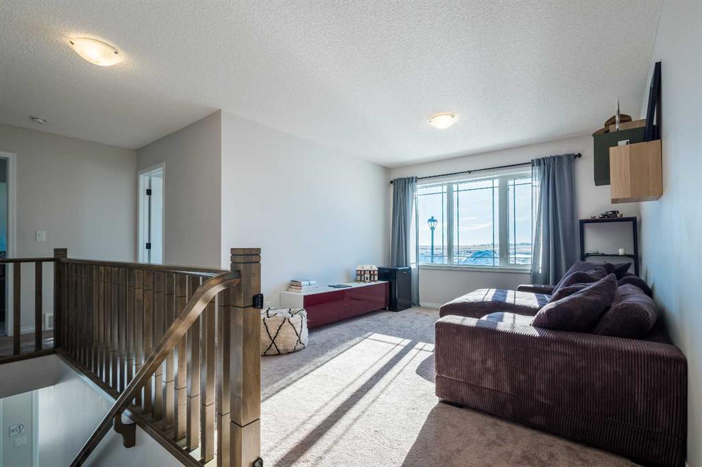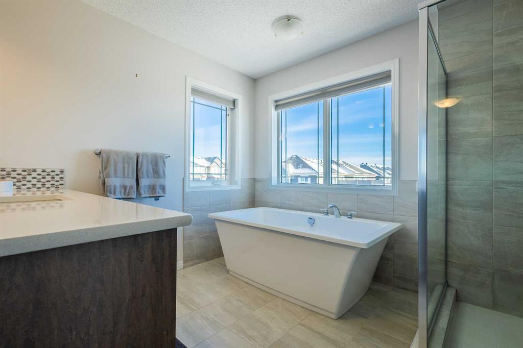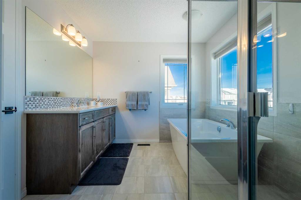 Upstairs, a sun-filled bonus room is surrounded by walls of windows and accented by a wraparound wood railing, creating a bright and airy retreat. A large upper-level laundry room and linen storage enhance everyday convenience. The primary bedroom comfortably accommodates a king-sized bed and features a walk-in closet and a spa-inspired ensuite with a floating soaker tub, glass walk-in shower, and extra-tall quartz-topped vanity. Two additional generously sized bedrooms and a well-appointed main bath continue the home’s light-filled design.