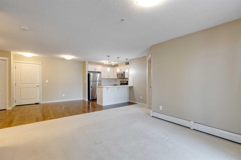 Thoughtfully designed for comfort, convenience and everyday ease, this updated main-level condo offers a highly functional layout with added mobility-friendly benefits. Just steps from the lobby with easy access to the underground parking stall, making daily routines easier for those seeking minimal stairs and smooth transitions. An open floor plan creates a natural flow between the kitchen, dining and living areas, supporting both relaxed living and effortless entertaining. Updated finishes enhance the kitchen, where stainless steel appliances, crisp white cabinetry and a peninsula island with breakfast bar provide a welcoming place to gather and connect. Clear sightlines extend into the adjacent living room, encouraging conversation and creating a warm, cohesive living space. Large patio sliders open directly to an exceptionally spacious 33 ft covered patio, offering a sheltered outdoor extension ideal for summer barbeques, morning coffee or quiet evenings surrounded by greenery. 2 well-proportioned bedrooms are thoughtfully separated for privacy, with the primary suite serving as a comfortable retreat complete with a large walk-in closet and a private 4-piece ensuite. A second bedroom and an additional 4-piece bathroom add flexibility for guests, home office use or shared living, while in-suite laundry enhances daily practicality. The building itself supports an easy, maintenance-free lifestyle, featuring a welcoming lobby with fireplace, seating area, a library that creates a true sense of community and is even large dog friendly. Underground, heated parking and a separate storage locker provide valuable convenience and security. Walkable access to nearby shopping, coffee spots, medical services and restaurants places everyday needs within easy reach, while an extensive pathway system encourages an active lifestyle with connections throughout the community and along the Bow River. Exclusive access to the Cranston Residents Association clubhouse adds meaningful lifestyle value, offering residents-only amenities including sports courts, a spray park, skating rink and year-round programming designed for all ages. A short drive or bike ride connects easily to South Health Campus, the world’s largest YMCA and the amenities of Seton, with Fish Creek Park close by for outdoor recreation. Quick access to Deerfoot and Stoney Trail supports seamless commuting in all directions, creating a location that balances convenience, recreation and long-term livability.