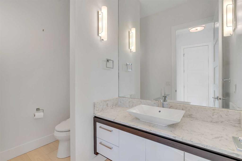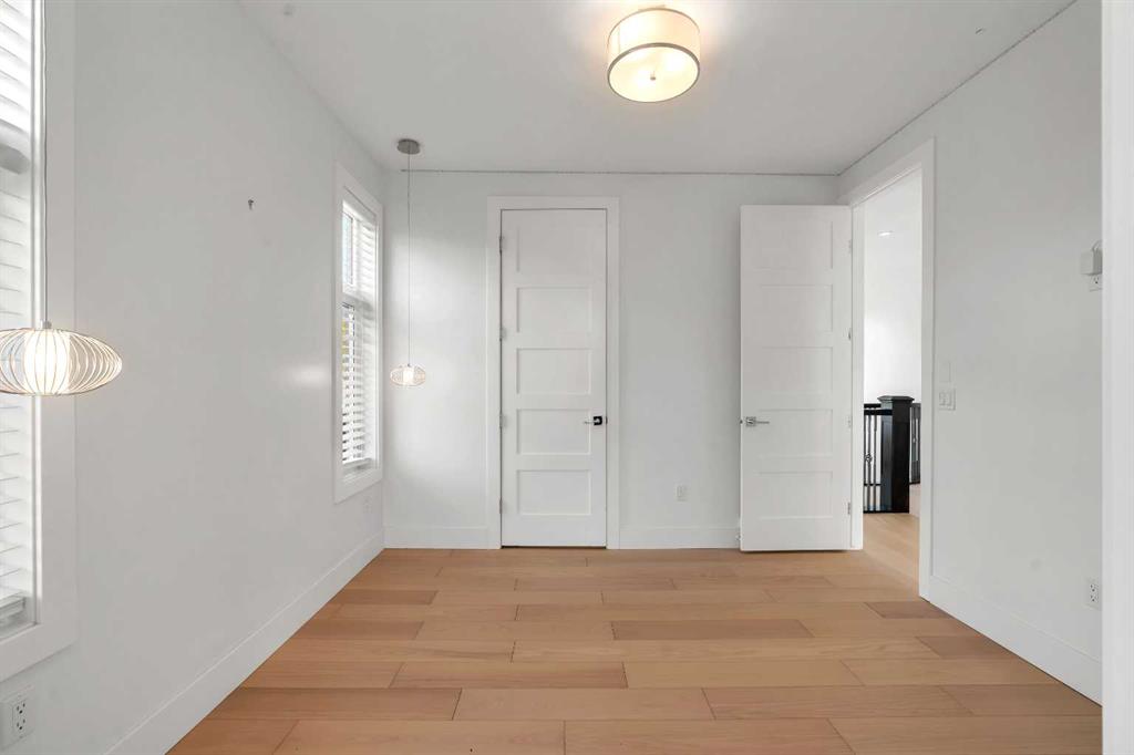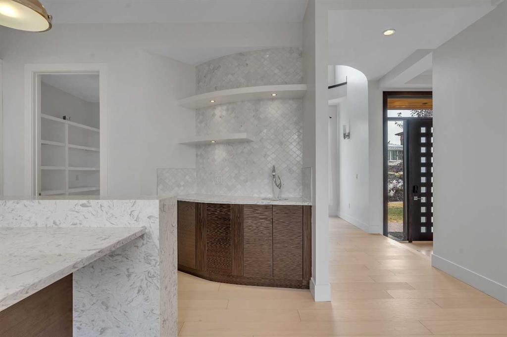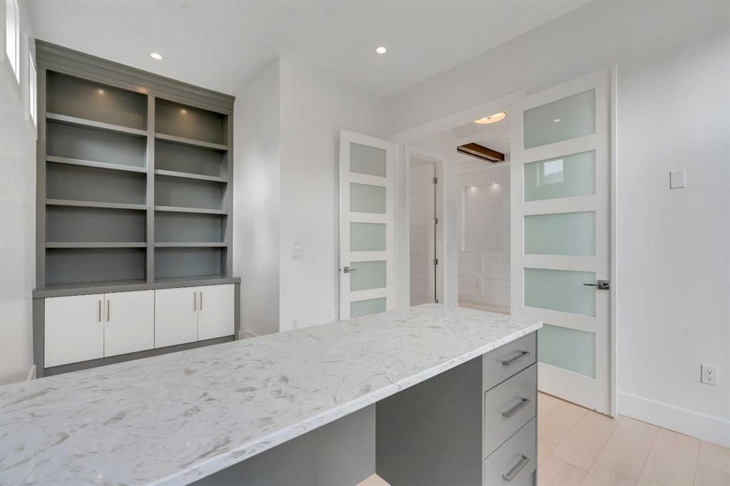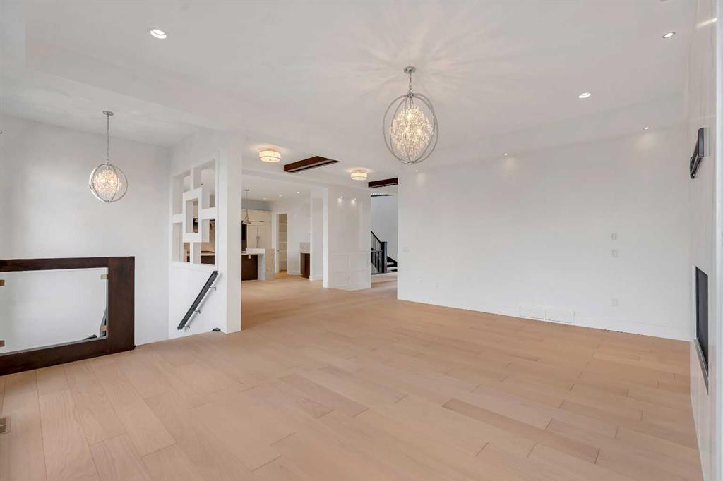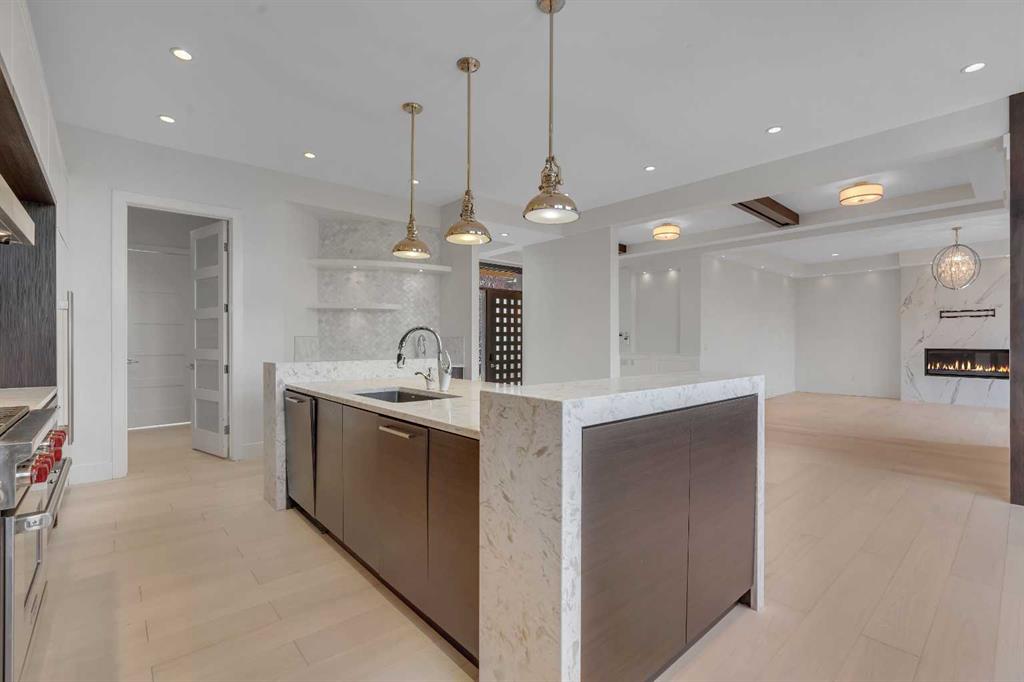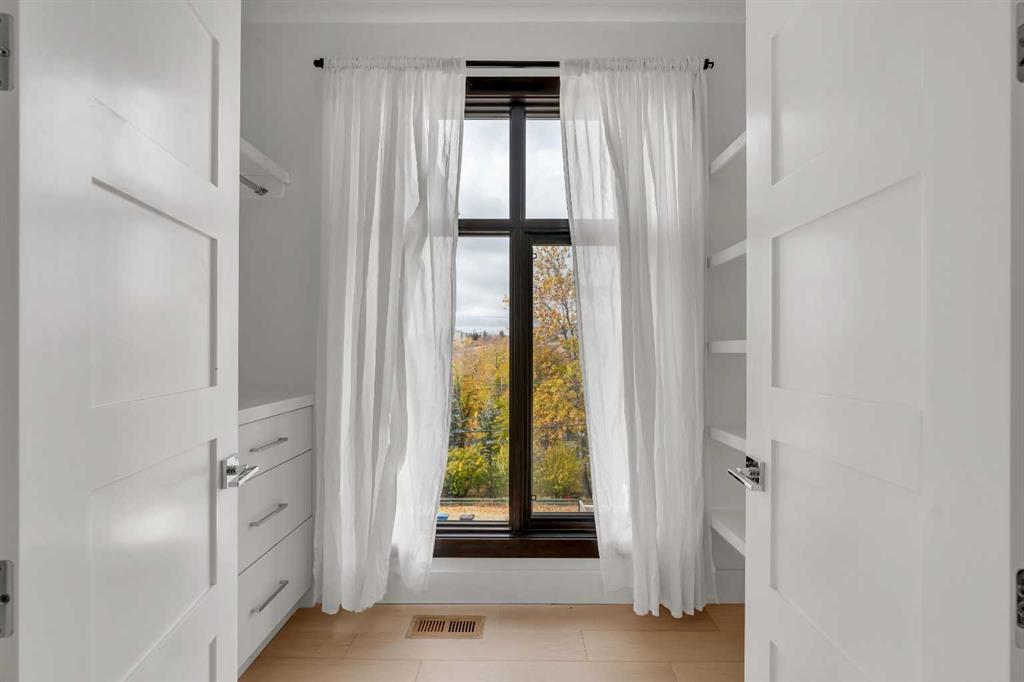 The perfect harmony of sophistication, light & function, this luxurious inner-city residence offers over 4,800 sq. ft. of refined living space backing west amid treetop outlooks & glowing sunset skies. A dramatic entry sets the tone with wide plank hardwood & a marble inlay, leading to soaring ceilings framed by custom millwork, exposed beams & black-clad windows that capture every nuance of daylight. French doors open to a private office detailed with built-ins, creating an ideal work-from-home sanctuary. The heart of the home is an exquisite designer kitchen that balances modern minimalism with warmth, showcasing pristine white cabinetry contrasted by rich wood accents, a waterfall-edge granite island & professional-grade Wolf appliances including a 6-burner gas range, steam oven & built-in espresso system. A curved wet bar & walk-through butler’s pantry enhance the home’s entertaining flow. Beyond, the dining room’s double-height ceiling, sculptural chandelier & wall of glass doors invite connection between indoors & out, while an automated awning provides shade over the upper deck for sunset dinners. The adjoining living room blends quiet luxury with comfort around a sleek linear fireplace wrapped in full-height marble, its ambiance carried by soft recessed lighting & serene west views. Ascend the glamorous curved staircase illuminated by a cascading crystal chandelier to the upper level. French doors lead to a sumptuous primary retreat where a private balcony, spa-inspired ensuite with steam shower & soaker tub, and a custom dressing room create a boutique-hotel experience. 2 additional bedrooms, each with its own ensuite, complete this level. The fully finished walkout lower level continues the home’s refined aesthetic, offering a seamless blend of comfort & sophistication. Heated epoxy floors provide quiet warmth underfoot, while a sleek wet bar invites easy entertaining & relaxed evenings with friends. The spacious recreation area is ideal for movie nights or game-day gatherings, complemented by a well-appointed fourth bedroom & a stylish full bath for guests. A versatile den adds flexibility for a gym, yoga studio or private theatre, & dual stairwells connect this level effortlessly to the rest of the home for exceptional flow. Outside, the fenced west yard offers ample green space for relaxation or play, with a detached double garage featuring its own electrical panel, drive-through door & additional RV parking. Thoughtful upgrades include remote blinds, smart thermostats, tankless water heating, central air conditioning, in-floor boiler heat, sump pump & central vacuum. Perfectly positioned within Hounsfield Heights/Briar Hill, this exceptional property offers unmatched access to parks, top schools, SAIT, Kensington, the Bow River pathway system, North Hill Centre, hospitals, downtown & the mountains beyond—all wrapped in elevated design & timeless luxury!
