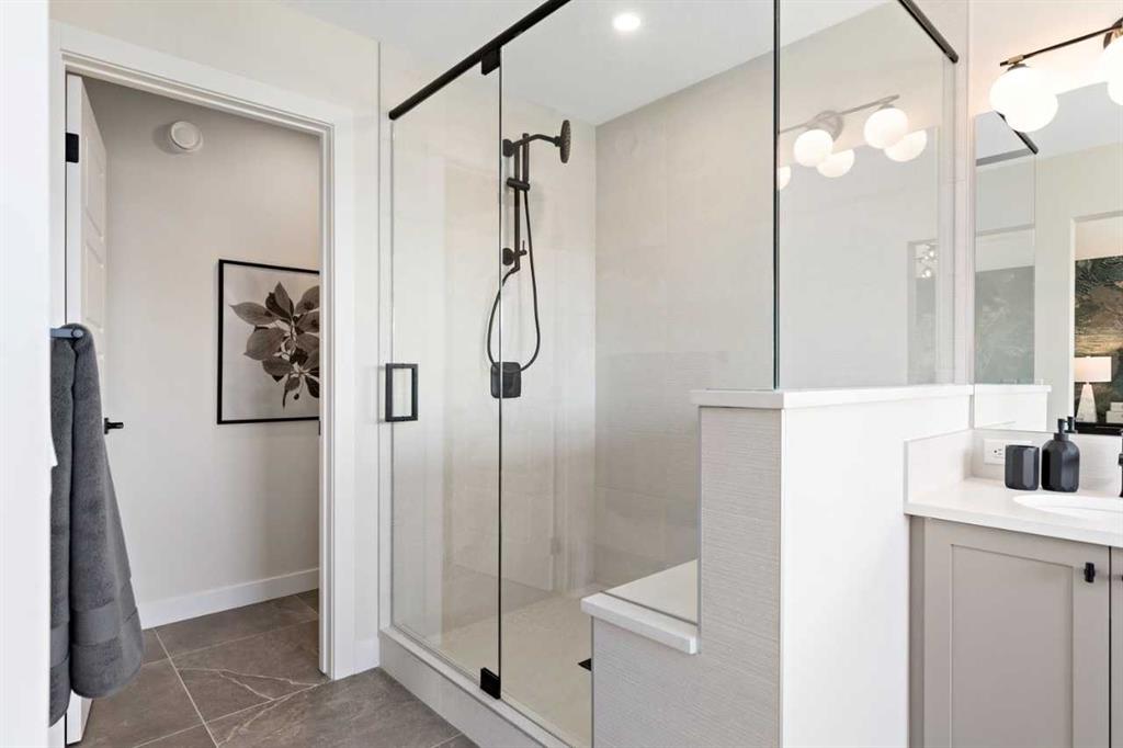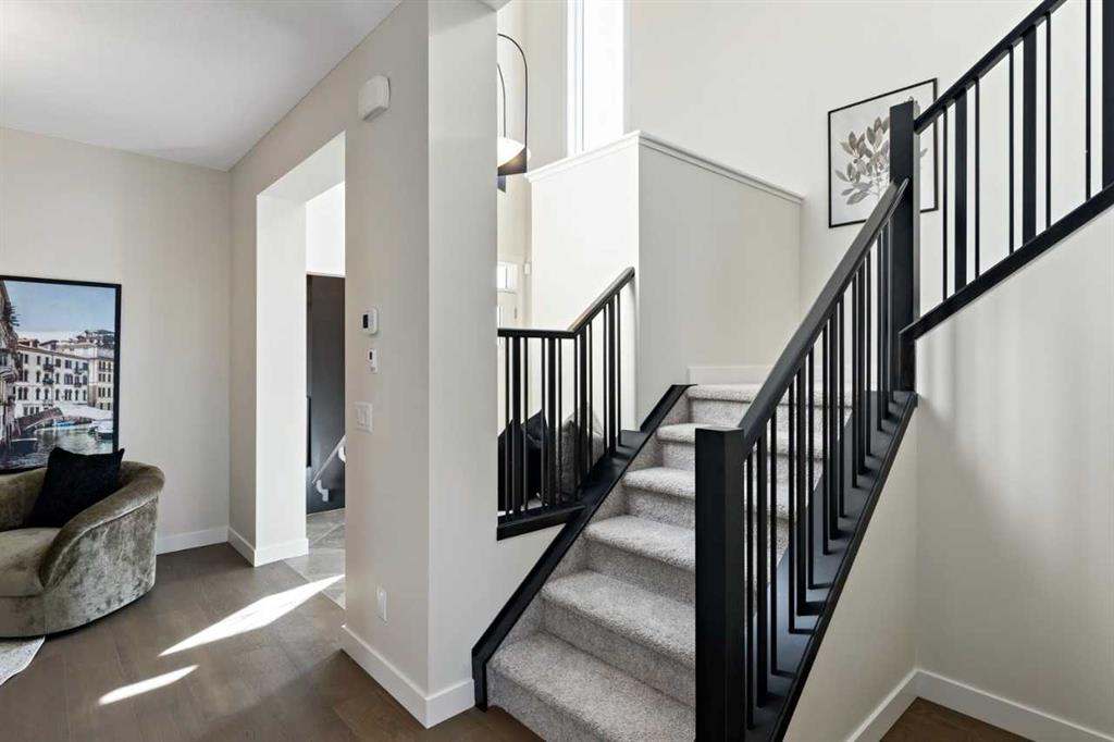 Located in East Calgary, the vibrant community of Huxley offers the perfect blend of amenity-rich city living and small-town comfort. Surrounded by natural grasslands, preserved greenspaces, and a scenic wetland park, Huxley provides a peaceful setting just minutes from East Hills Shopping Centre and major routes. The Oakridge model by Trico Homes showcases superior craftsmanship and thoughtful design. This spacious 2,158 sq. ft. home features 9' ceilings, an open-to-below foyer, engineered hardwood flooring, quartz countertops, and high-efficiency appliances. The main floor includes a large kitchen with abundant cabinet and counter space, soft-close drawers, a walk-in pantry, and a convenient flex room. Additional highlights include a side entrance for future basement development, with an option for a main-floor bedroom, full bath, and spice kitchen. Photos shown are from the Oakridge showhome. Upstairs, you'll find a large bonus room plus three bedrooms, including a primary bedroom designed for two, with an expansive walk-in closet and a spa-inspired ensuite. Photos are representative