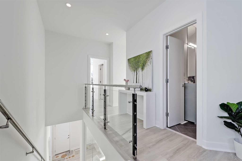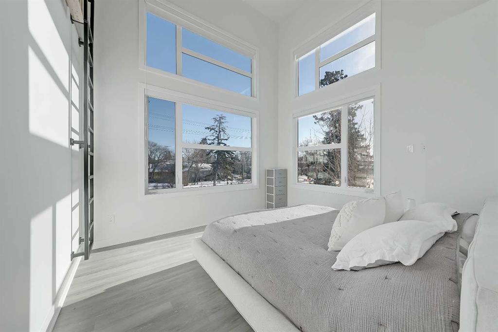 *VISIT MULTIMEDIA LINK FOR FULL DETAILS, INCLUDING IMMERSIVE 3D TOUR & FLOORPLANS!* Welcome to this rare end unit fronting green space. This highly upgraded Bordo townhome showcases over 2,300 sq ft (over 1,700 sq ft above grade), soaring ceilings, a private fenced yard, a fully developed basement, and a rare attached insulated garage. This home delivers the comfort and scale of a detached home with the ease of low-maintenance inner-city living. The bright main floor features 10-ft ceilings and expansive windows that fill the space with natural light. The contemporary, warm living room has a massive window overlooking the adjacent green space. It centres on a tiled feature wall with a gas fireplace and is enhanced by built-in ceiling speakers. The rear kitchen anchors the layout with a quartz waterfall island and counters, a sleek glass backsplash, stainless steel appliances including an induction cooktop, a dual-basin undermount stainless steel sink, a discreet hood fan, and ample high-end cabinetry. A powder room and a mudroom with direct access to the attached garage add everyday functionality. Upstairs, the primary suite impresses with 16.6-ft ceilings, oversized windows, a large walk-in closet, a bonus loft, and a spa-inspired 5-pc ensuite featuring heated tile floors, a dual-sink vanity with quartz and storage, a soaker tub with tile surround, and a fully tiled stand-up shower with 10mm glass door. A second bedroom with 14.5-ft ceilings, a full 4-pc bathroom, a versatile bonus room, and a convenient upper-floor laundry closet complete the upper floor. The fully developed basement features 9-ft ceilings, a spacious rec room, plus a third bedroom and a full bathroom—ideal for guests or for use as a home office. Mechanical upgrades include a high-efficiency furnace, humidifier, and HRV system. Enjoy a private fenced yard with a gas line for a BBQ, plus immediate access to the large green space outside the door. Located in the heart of Renfrew, just minutes to downtown, 16 Ave, Edmonton Trail, Deerfoot Trail, schools, parks, shopping, Calgary Zoo, and the Renfrew Aquatic Centre, this home offers outstanding inner-city convenience. Schedule a private showing today!