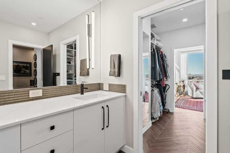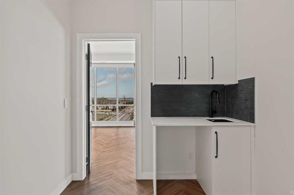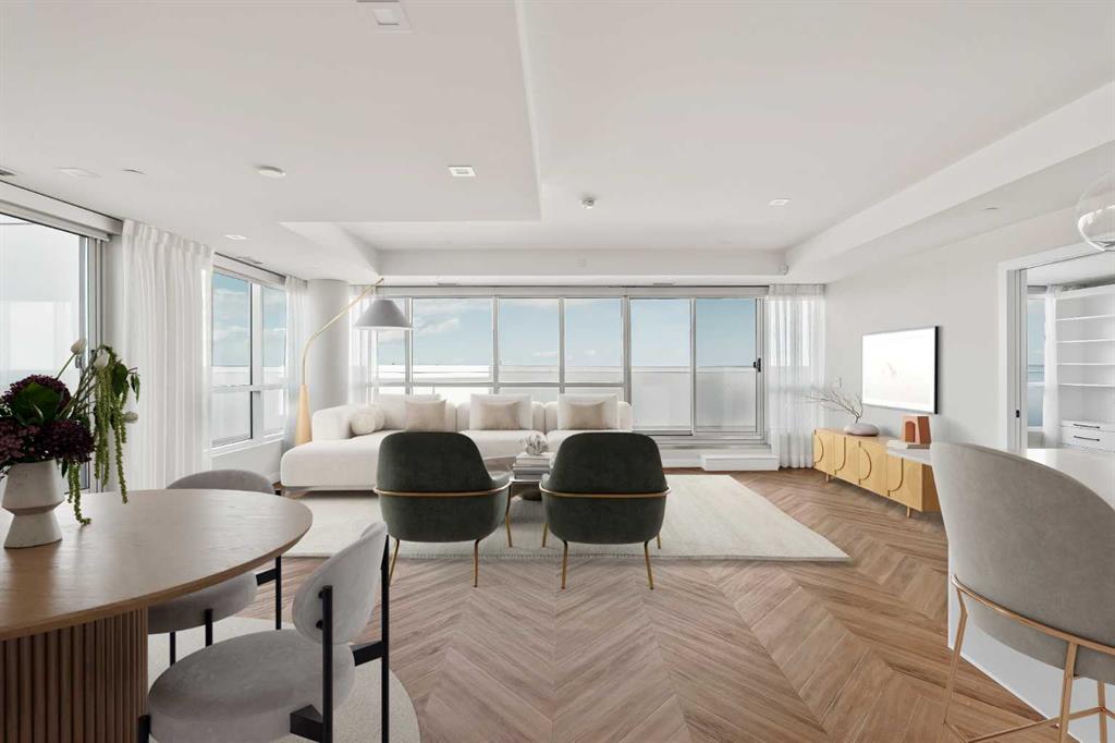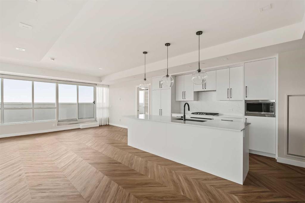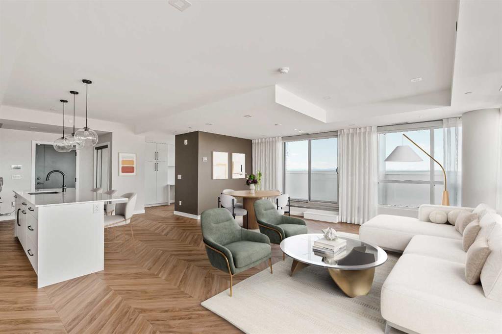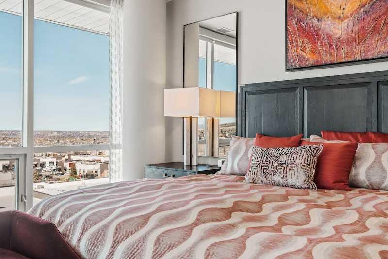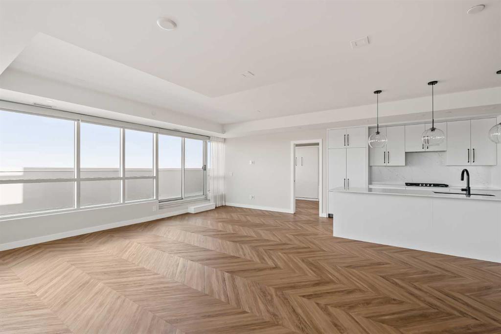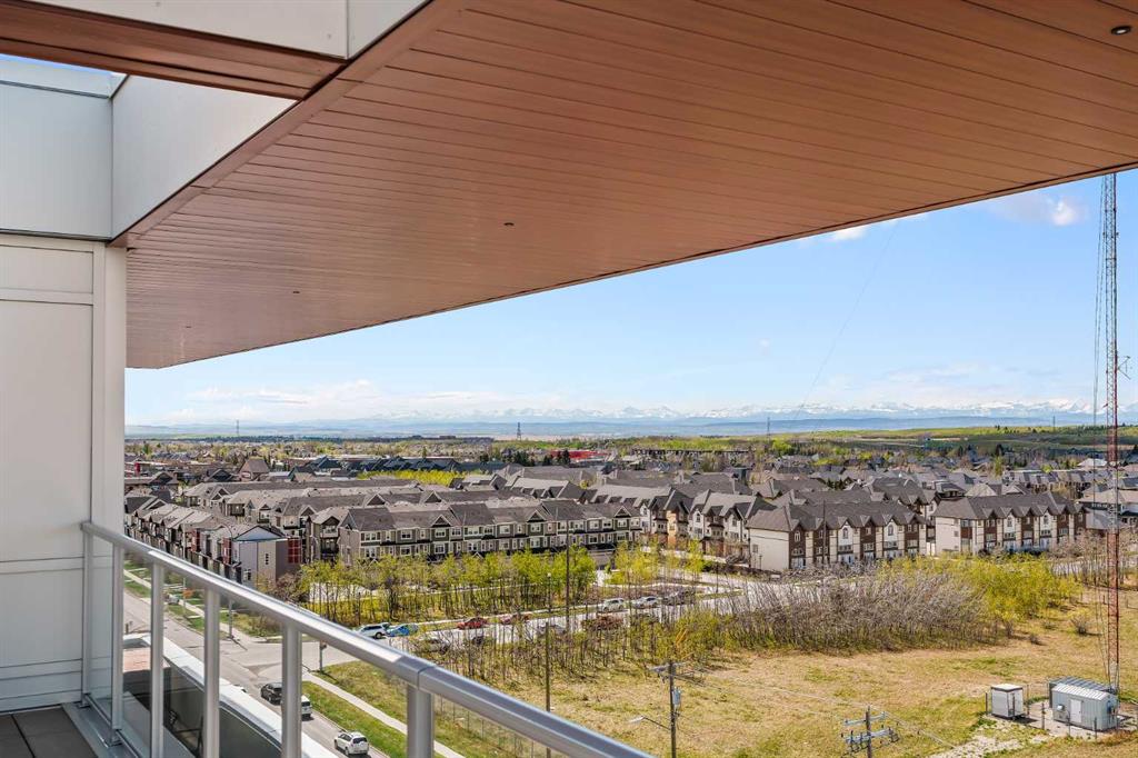Proudly presenting Suite 717, the most coveted West facing corner penthouse in the prestigious Gateway buildings. This extraordinary home offers stunning panoramic mountain views, evening sunsets, impeccable custom upgrades, and a lifestyle of sophistication and comfort. Thoughtfully designed, the home features electric blackout blinds on all windows, a high-end security system with burglar-proof locks, and a versatile main floor with a custom Murphy bed, built-in office, two separate office spaces, refined window treatments, a customized laundry room, and comfort-raised toilets. The gourmet kitchen is a true showpiece, boasting a single bowl sink, garburator, oversized globe pendant lights, dimmable lighting, and upgraded pull out waste bins. Additional luxuries include two premium parking stalls directly outside of the elevator, two storage lockers, accessibility features throughout, and a bonus spacious in suite storage area under the stairs. This penthouse also comes with air conditioning, chevron flooring, quartz countertops, LED square pot lights, solid core doors, soft close drawers, and a gas line on the patio. Built in 2019 with concrete construction and exceptional soundproofing, this boutique style building is unlike anything else in the city. Residents enjoy access to a rooftop patio, stylish residents' lounge, concierge service, visitor parking, EV chargers, and secure bike storage. Located in the Trendy West District this property is steps from Sobeys, Big T's BBQ, UNA Pizza, Deville Coffee, F45 Gym, Hankki, YYC Cycle, and more, with quick access to Old Banff Coach Road, Stoney Trail, and nearby mountain escapes. The fast growing West District will soon offer over 1 million square feet of retail and commercial space, designed for a walkable lifestyle with 20-ft sidewalks and bike paths. Just 15 minutes from downtown, 5 minutes to Winsport, and 60 minutes to the Rockies, Suite 717 offers unmatched urban convenience with a breathtaking natural backdrop. Book your showing today!