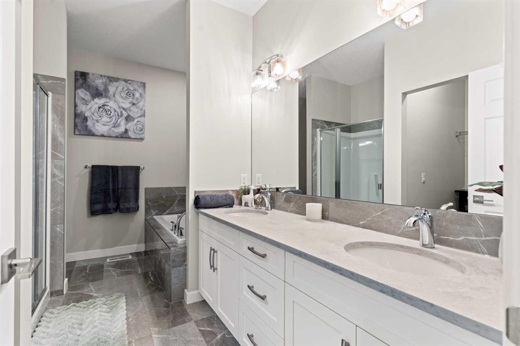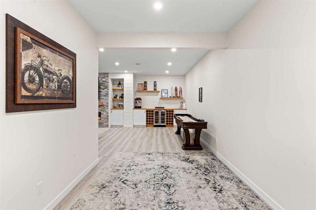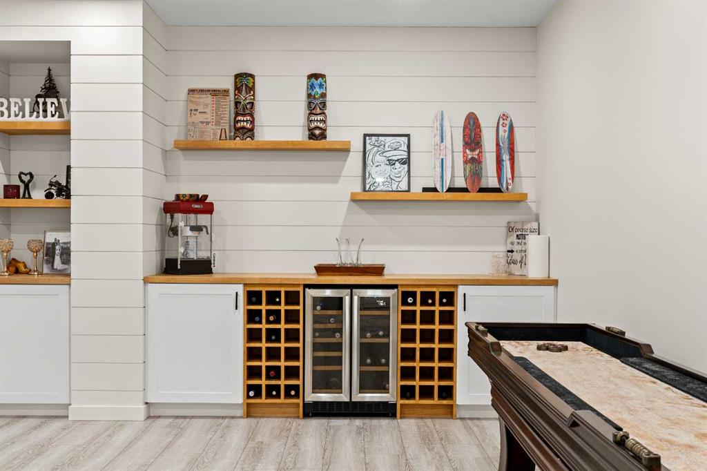 The chef-inspired kitchen is designed for both everyday living and entertaining, featuring abundant cabinetry, stainless steel appliances, a spacious eat-up island with seating for four, and a walk-in pantry. The open great room offers a remote-controlled gas fireplace and generous seating area, creating a warm and inviting atmosphere. The main floor also includes a second bedroom, a 4-piece bathroom, convenient laundry, and a primary retreat complete with a walk-in closet and spa-like ensuite with dual sinks, a stand-up shower, and a relaxing soaker tub. The fully finished basement feels like your own private movie room, highlighted by a built-in stone-surround fireplace, custom bar, and expansive entertainment space—perfect for hosting or unwinding. A guest bedroom and full bathroom complete this exceptional lower level.
