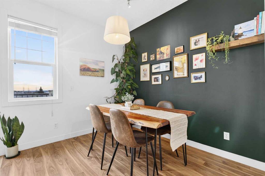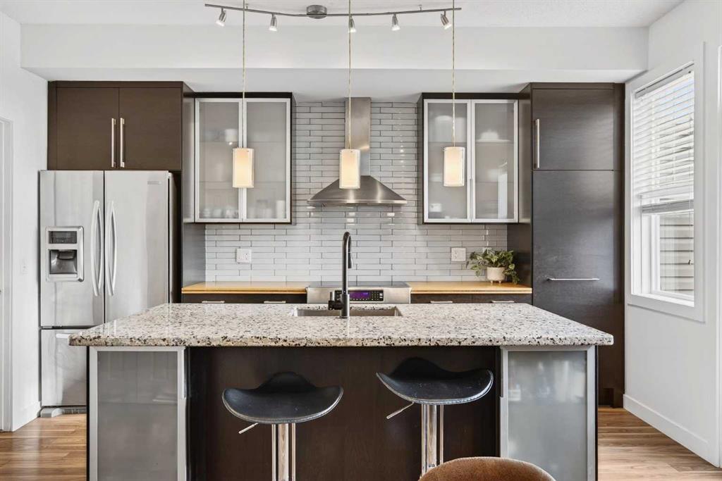 Beautifully UPDATED, immaculately maintained and truly MOVE-IN READY, this top-floor townhome shows 10/10 and offers an exceptional location with easy access to Aspen Landing, the 69 Street LRT, Westside Recreation Centre, downtown Calgary, and a QUICK ESCAPE WEST TO BANFF AND CANMORE. The main living level features a BRIGHT, open-concept layout with 9’ ceilings, updated laminate flooring, new trim, and a beautifully renovated kitchen complete with stainless steel appliances, ceiling-height cabinetry with built-in lighting, soft-close doors, a pantry cabinet, a large granite island, and updated lighting throughout. Step out from the kitchen to the sunny south-facing balcony with gas BBQ hookup, perfect for morning coffee or evening meals. The spacious dining area easily accommodates a full-size table, while the inviting living room offers a bright, generous space and a west-facing nook ideal for a home office or reading corner. A convenient 2-piece bathroom and laundry room with newer washer and dryer and additional storage complete this level, with the hot water tank replaced in 2020. Upstairs, 9’ ceilings continue and you’ll find two generously sized bedrooms, including vaulted ceilings, a primary suite with double closets, a 3-piece ensuite, and a charming Juliet balcony, along with a second large bedroom and a full 4-piece bathroom. Carpets were replaced in 2019. This home also includes a titled single detached garage with attic storage. The well-managed, pet-friendly complex is ideally located close to countless amenities, with condo fees covering water, sewer, insurance, trash, HOA, and professional management, and average utility costs of approximately $140 per month.