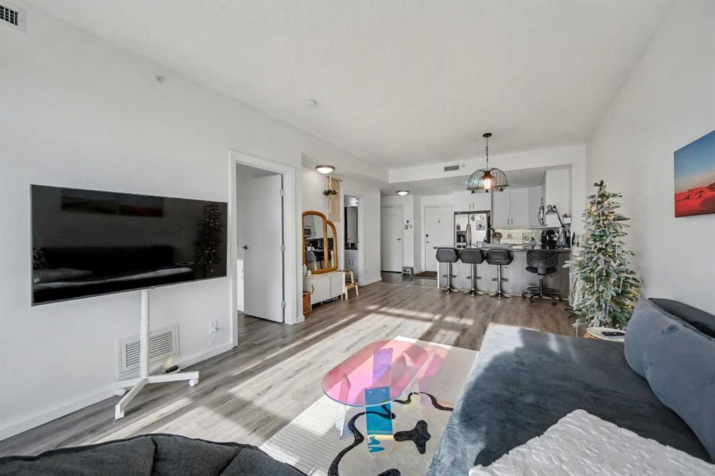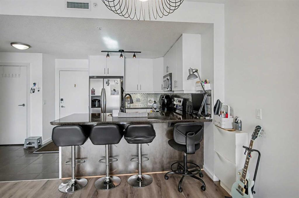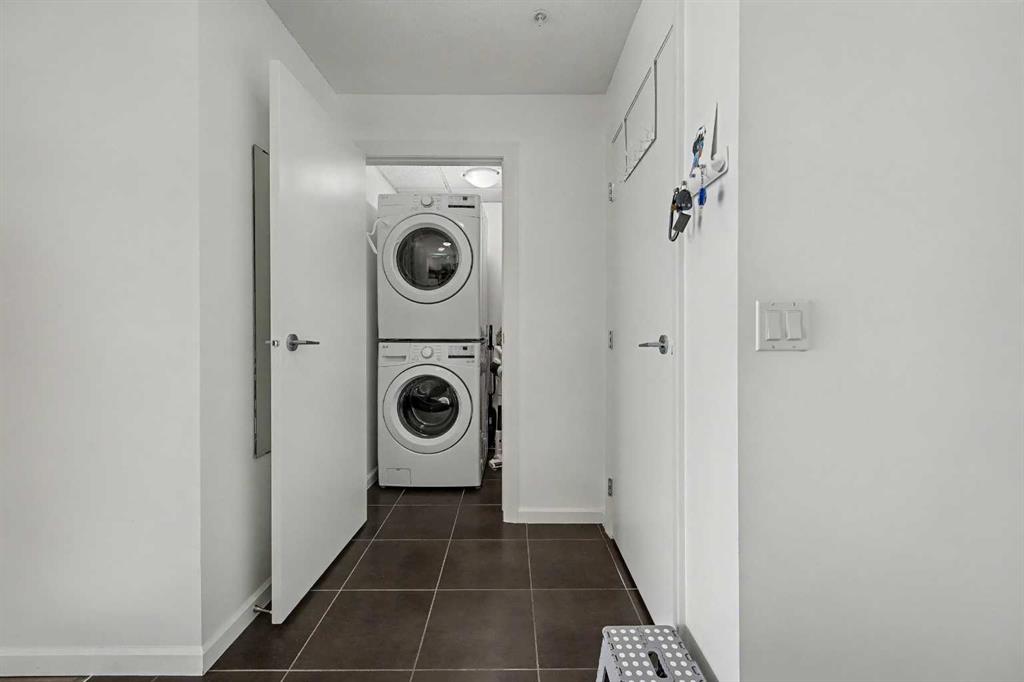 Urban Living at Its Best! Welcome to Vetro, where modern style meets unbeatable convenience. The open-concept layout features a modern kitchen with granite countertops, stainless steel appliances, a breakfast bar, and a striking tile backsplash. The bright living and dining space flows seamlessly, providing plenty of room to relax or entertain. The spacious bedroom includes a walk-through closet that leads into an ensuite bath, creating a private retreat. Note: Replaced washer/dryer (2023), flooring (2022), and repainted cabinets (2022). This unit comes with a titled underground stall and an assigned storage locker. The Vetro building is designed for elevated living, featuring a concierge service and night time security for ultimate peace of mind. Wellness enthusiasts will appreciate the expansive two-level fitness center, complete with a hot tub, steam showers, and an inviting games and social lounge with a pool table and cozy fireplace. Host movie nights in the private theatre room or relax in the outdoor courtyard. Convenience is at your doorstep with Shoppers Drug Mart and Canada Post located at the base of the building, and Sunterra Market and the BMO Centre just a short walk away. The Stampede Grounds, New Scotia Place Event Centre, Saddledome, LRT transit, and the vibrant shops and restaurants of 17th Avenue are all within easy reach. Lindsay Park and the MNP Community & Sports Centre are nearby, supporting an active, connected lifestyle. Whether you're a young professional, savvy investor, empty nester, or first-time buyer seeking to own instead of rent, this condo delivers an exceptional blend of luxury, convenience, and an unbeatable location.