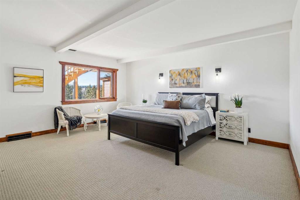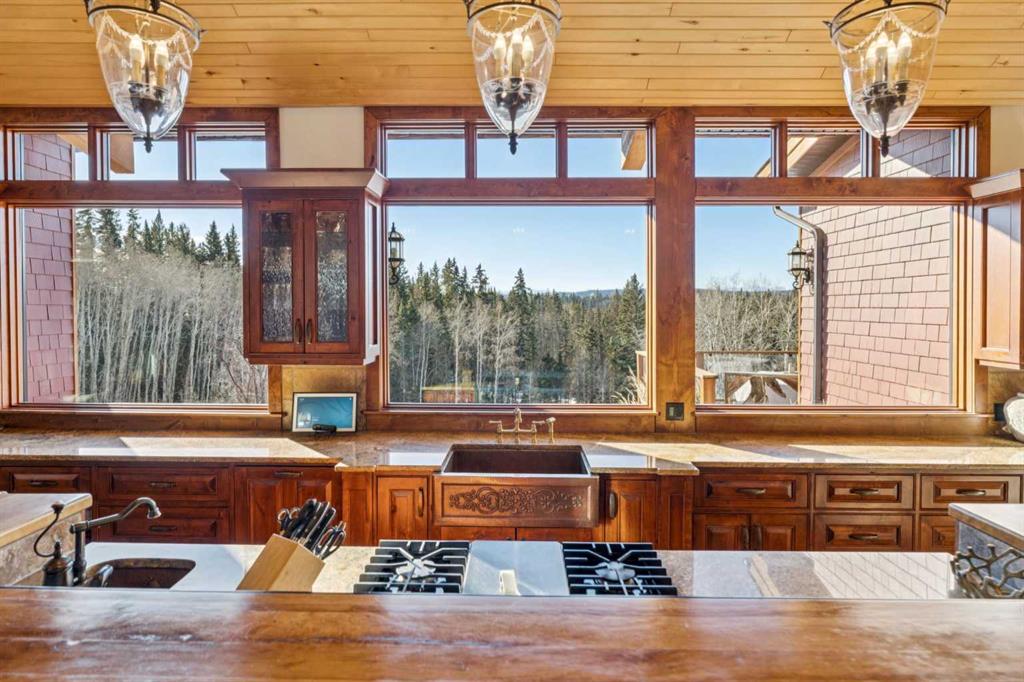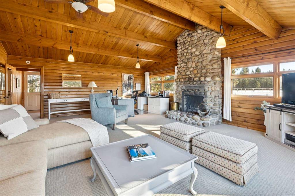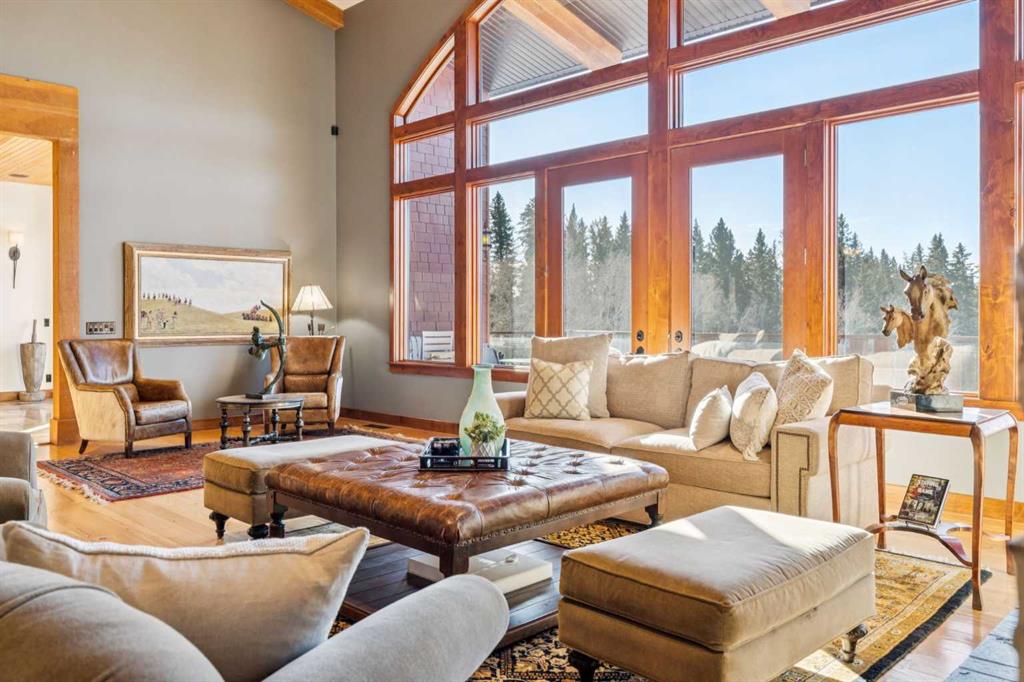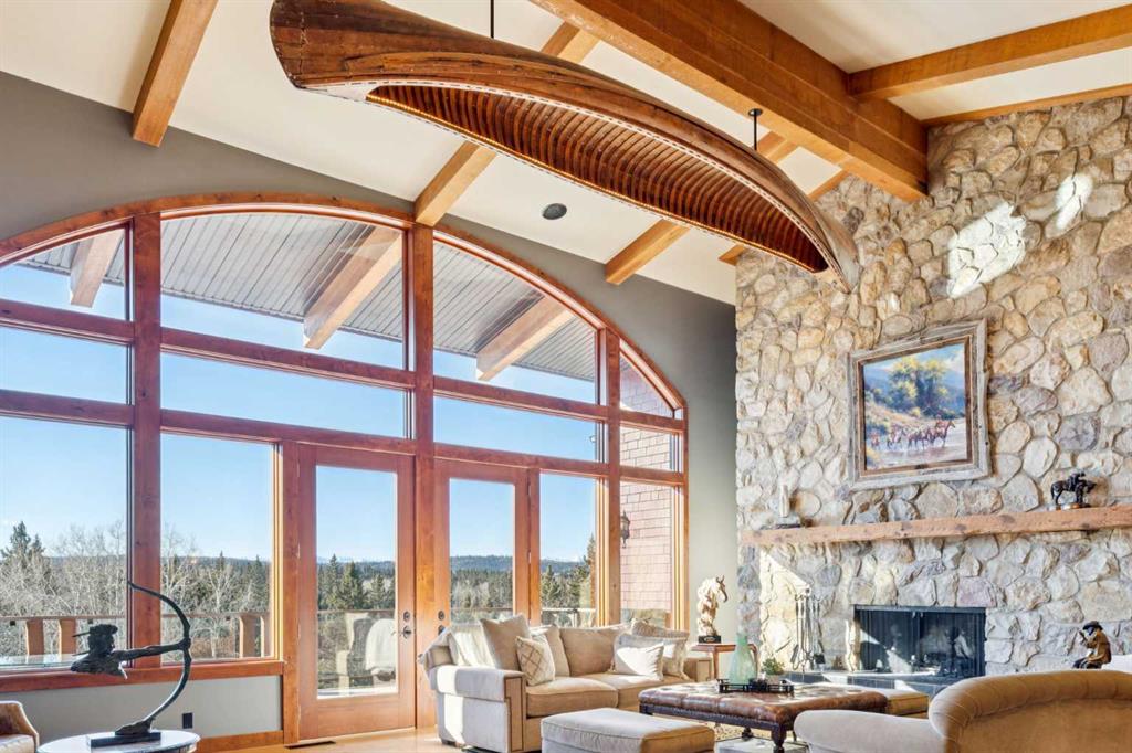 This is a property defined by lifestyle. From the moment you arrive at the secure electric gate and begin the gentle journey down the winding, tree-lined driveway, the outside world quietly fades away. Take a deep breath—what awaits is a rare sense of calm, privacy, and connection to nature. Perched above Fish Creek, this remarkable 7,222 sq. ft. bungalow commands breathtaking views of the creek below, open fields, rolling foothills, and distant mountain vistas. A wraparound deck spanning the south and west sides of the home invites you to fully embrace the outdoors—whether watching wildlife pass by, listening to the soft sounds of the creek, or enjoying sunsets that never disappoint. Step through the dramatic front entrance and you are immediately greeted by soaring vaulted ceilings, a stunning wall of windows, and uninterrupted views beyond. Custom stonework and timeless timber-frame construction define the home’s architectural character, creating a seamless blend of natural materials and refined craftsmanship. The expansive living spaces are perfectly designed for entertaining—whether hosting intimate gatherings or larger celebrations, indoors or out. This is a residence where the outdoors is intentionally brought in, offering warmth, scale, and a true sense of place. The gourmet kitchen features a generous dining area, an abundance of cabinetry and counter space, and a beautiful screened summer dining room—ideal for seasonal entertaining. Enhancing the lifestyle experience is an attached pool house complete with a 16' x 30' indoor heated pool, hot tub, games area, and a cozy sitting space with fireplace for year-round enjoyment. The primary retreat features soaring vaulted ceilings, a wood-burning fireplace, and two sets of patio doors leading to the deck and pool area. The luxurious ensuite offers a two-person air tub, double vanities, walk-in shower, and a spacious walk-in closet with floor-to-ceiling built-ins. The main floor office showcases distinctive copper ceiling details, a charming pot-belly stove, and two sets of custom built-in drawers and cabinetry. An attached private cabin provides ideal accommodations for children, a nanny, or staff, complete with its own kitchen, two bedrooms, living area, and full bathroom. The fully developed lower level offers a spacious recreation room with wood-burning fireplace and walkout to a covered patio. Additional features include a wet bar, sauna, cedar closet, back up gas generator, generous storage, a four-piece bathroom, and a large bedroom.