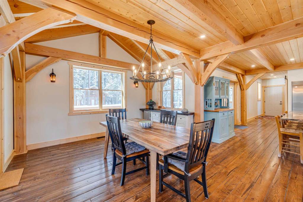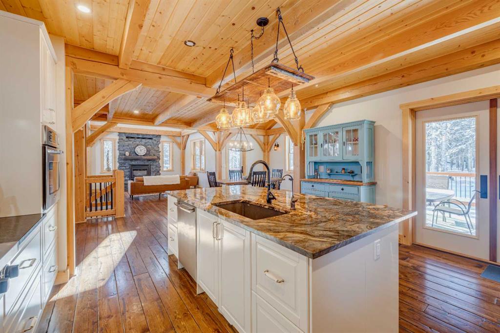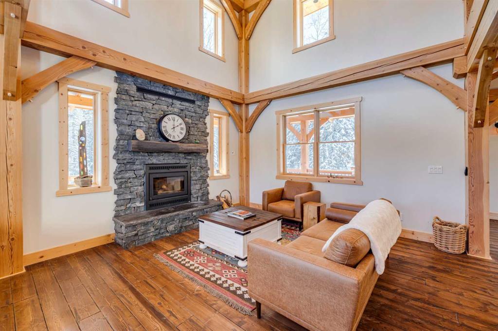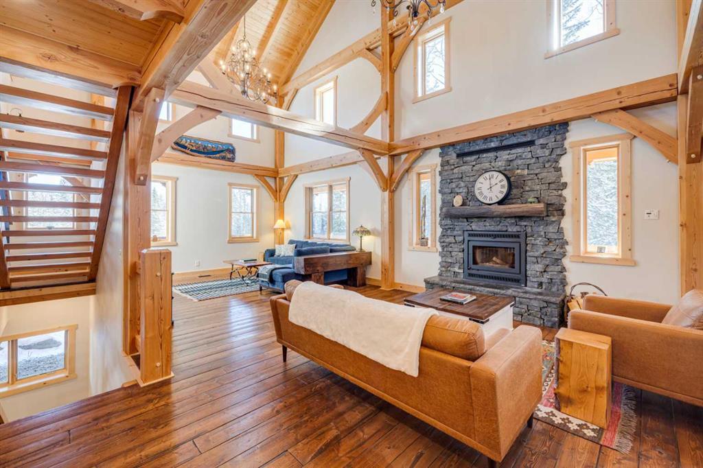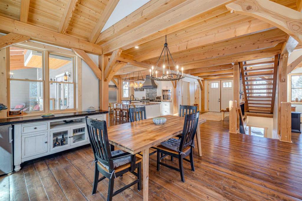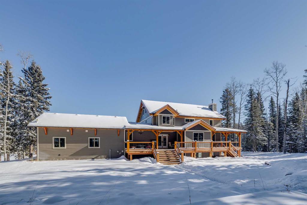 BRAGG CREEK TIMBER FRAME HOME ON 9.71 ACRES WITH CREEK & POND! This custom 2019 full structural timber frame home in West Bragg Creek offers over 4,000 sq ft of exceptional craftsmanship and a lifestyle immersed in nature. Set on a private acreage with a year-round creek, pond, and Trans Canada Trail access at the end of the driveway connecting you directly to world-class Kananaskis Country, this property is the ultimate retreat for outdoor enthusiasts and families seeking space, serenity, and adventure. Home Highlights: Hand-sculpted, pegged DOUGLAS FIR BEAMS AND COLUMNS, soaring vaulted ceilings, and walls of windows that frame panoramic views and flood the home with natural light. Custom pine hardwood flooring and an open-tread staircase carry the craftsmanship throughout every level. Open concept great room with stone wood-burning fireplace, perfect for cozy winter nights after skiing or snowshoeing. Chef's kitchen with granite counters, central island, gas cooktop, and oversized side-by-side fridge/freezer designed for entertaining, holiday gatherings, and farm-to-table meals from your own greenhouse. Main floor bedroom/flex room provides ideal accommodations for guests, a home office, or multigenerational living, paired with laundry, mud room, and 2-piece bath for complete main-level functionality. Up the custom open-tread staircase, a very private primary retreat with luxurious 5-piece ensuite, jetted tub, tile shower, and double vanity, plus den/flex space as the perfect adult getaway. The loft overlooking the den and great room below delivers a magical, open-air feel that can be whatever you envision. Fully developed lower level with large family and games areas, three additional bright bedrooms, and flexible 2-piece and 3-piece bathrooms, ideal for movie nights, teens' hangouts, or guest accommodations. In-floor heating on all 3 levels and garage. 12" ICE foundation and roof (R60 insulating value) for exceptional efficiency and year-round comfort. Tankless hot water system. Wrap-around covered deck for year-round outdoor living, from summer barbecues to watching wildlife wander through the property. Property Features: 9.71 acres with creek, pond, and endless room to explore. Fully fenced and cross-fenced, ideal for horses and pets. Deluxe treehouse, firepit area, and miles of trails connecting directly to the natural beauty of Kananaskis Country via Trans Canada Trail at the end of the driveway. 200 sq ft powered GREENHOUSE with water supply supporting sustainable living and year-round growing. Abundant, high-quality well water and high-end septic mound system. Oversized heated double garage with 12' ceilings and 60-amp sub-panel, ready for a workshop, EV charging, or all your recreational gear. Minutes to Bragg Creek amenities and world-class Kananaskis Country recreation, with three convenient highway routes to Calgary. A rare opportunity to own a modern timber frame home in one of Alberta's most sought-after lifestyle communities.