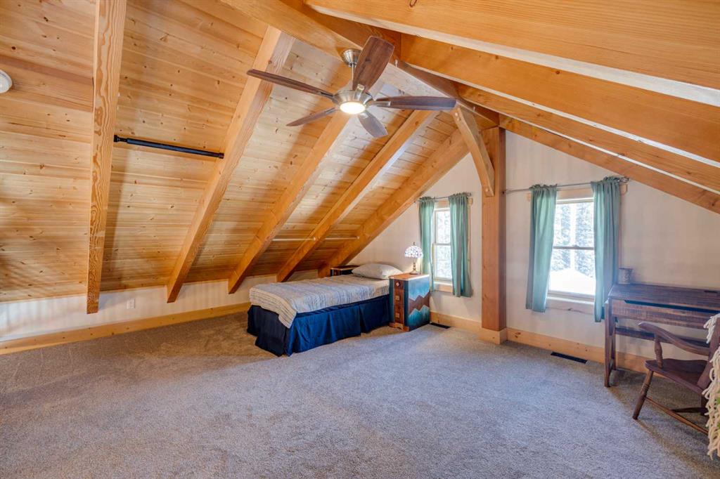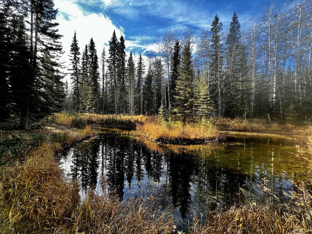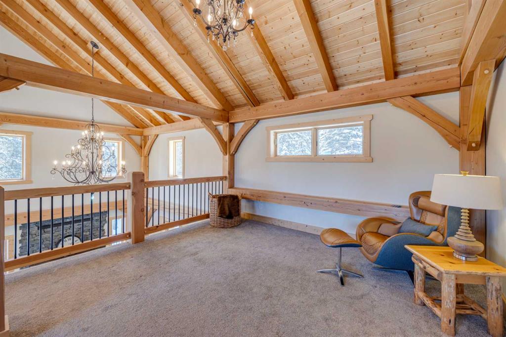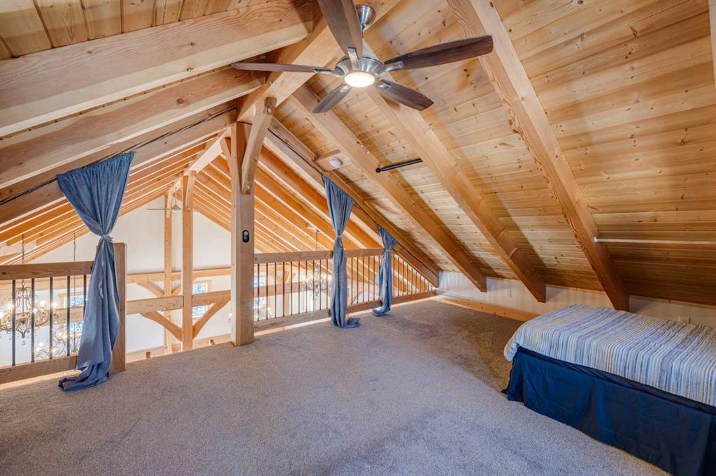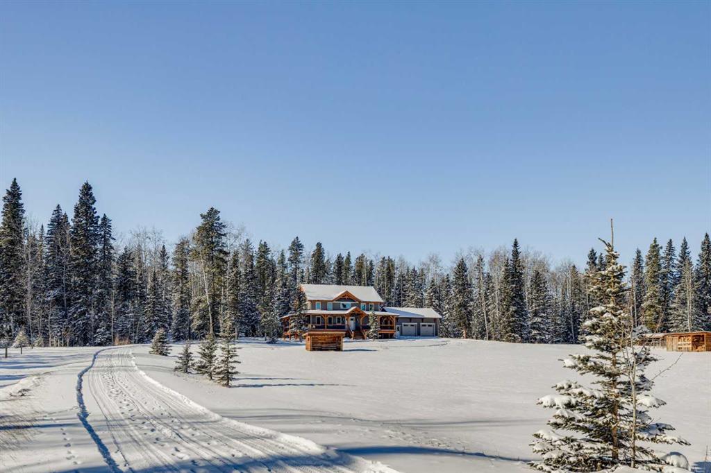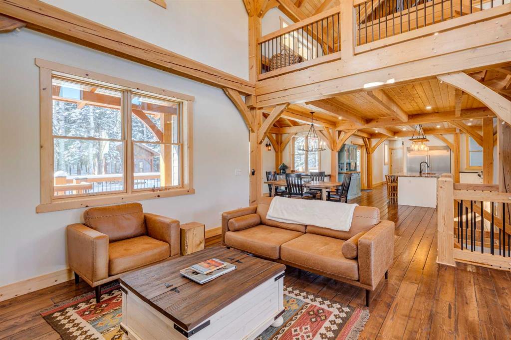 BRAGG CREEK TIMBER FRAME HOME ON 9.71 ACRES WITH CREEK & POND! This custom 2019 full structural timber frame home in West Bragg Creek offers over 4,000 sq ft of exceptional craftsmanship and a lifestyle immersed in nature. Set on a private acreage with a year-round creek, pond, and Trans Canada Trail access at the end of the driveway connecting you directly to world-class Kananaskis Country, this property is the ultimate retreat for outdoor enthusiasts and families seeking space, serenity, and adventure. Home Highlights: Hand-sculpted, pegged DOUGLAS FIR BEAMS AND COLUMNS, soaring vaulted ceilings, and walls of windows that frame panoramic views and flood the home with natural light. Custom pine hardwood flooring and an open-tread staircase carry the craftsmanship throughout every level. Open concept great room with stone wood-burning fireplace, perfect for cozy winter nights after skiing or snowshoeing. Chef's kitchen with granite counters, central island, gas cooktop, and oversized side-by-side fridge/freezer designed for entertaining, holiday gatherings, and farm-to-table meals from your own greenhouse. Main floor bedroom/flex room provides ideal accommodations for guests, a home office, or multigenerational living, paired with laundry, mud room, and 2-piece bath for complete main-level functionality. Up the custom open-tread staircase, a very private primary retreat with luxurious 5-piece ensuite, jetted tub, tile shower, and double vanity, plus den/flex space as the perfect adult getaway. The loft overlooking the den and great room below delivers a magical, open-air feel that can be whatever you envision. Fully developed lower level with large family and games areas, three additional bright bedrooms, and flexible 2-piece and 3-piece bathrooms, ideal for movie nights, teens' hangouts, or guest accommodations. In-floor heating on all 3 levels and garage. 12" ICE foundation and roof (R60 insulating value) for exceptional efficiency and year-round comfort. Tankless hot water system. Wrap-around covered deck for year-round outdoor living, from summer barbecues to watching wildlife wander through the property. Property Features: 9.71 acres with creek, pond, and endless room to explore. Fully fenced and cross-fenced, ideal for horses and pets. Deluxe treehouse, firepit area, and miles of trails connecting directly to the natural beauty of Kananaskis Country via Trans Canada Trail at the end of the driveway. 200 sq ft powered GREENHOUSE with water supply supporting sustainable living and year-round growing. Abundant, high-quality well water and high-end septic mound system. Oversized heated double garage with 12' ceilings and 60-amp sub-panel, ready for a workshop, EV charging, or all your recreational gear. Minutes to Bragg Creek amenities and world-class Kananaskis Country recreation, with three convenient highway routes to Calgary. A rare opportunity to own a modern timber frame home in one of Alberta's most sought-after lifestyle communities.