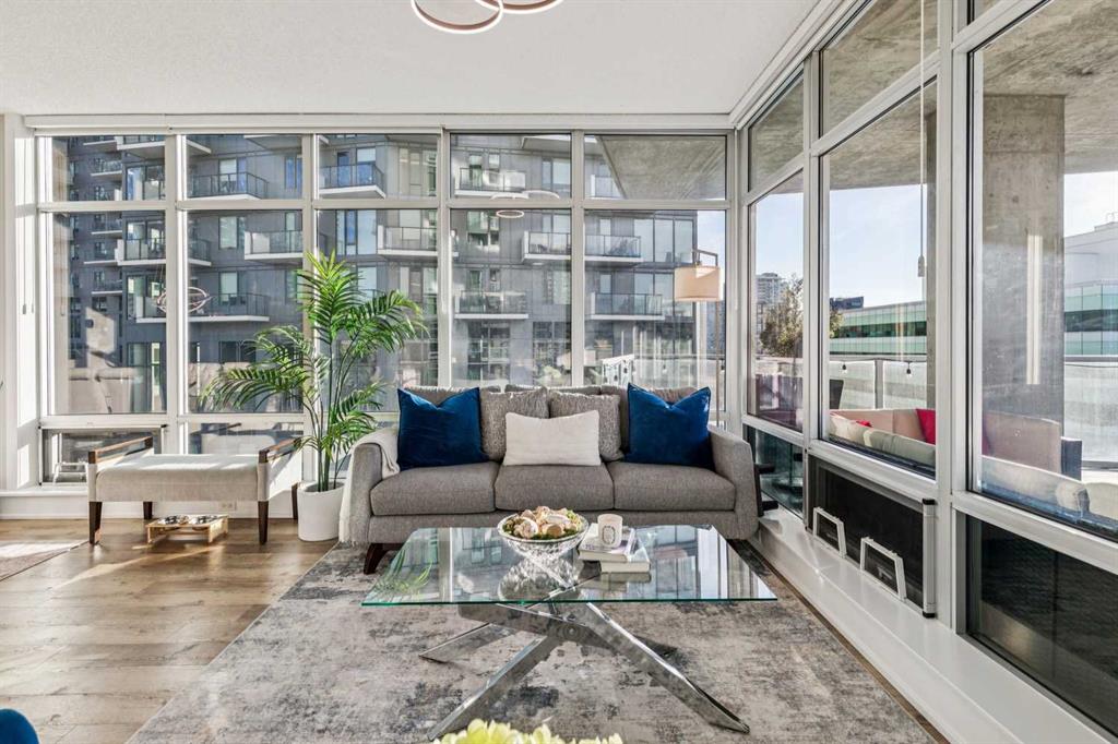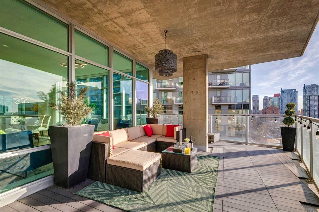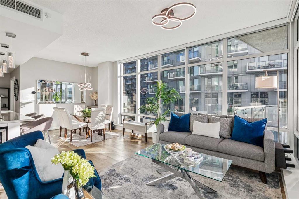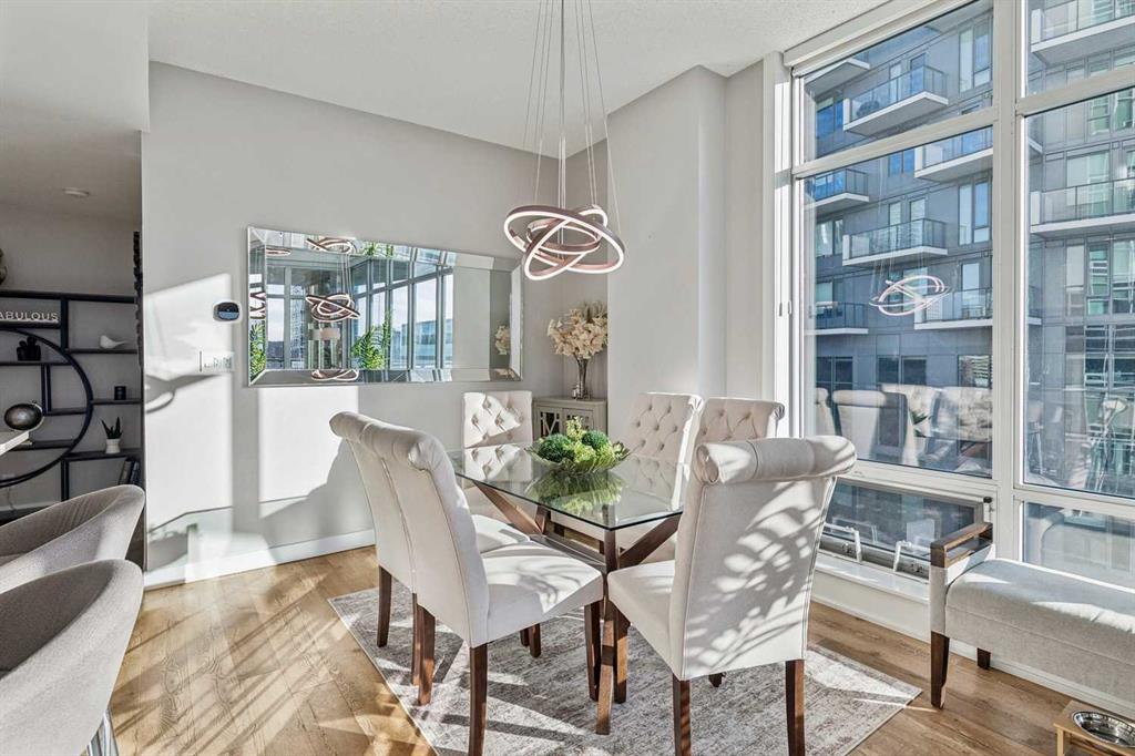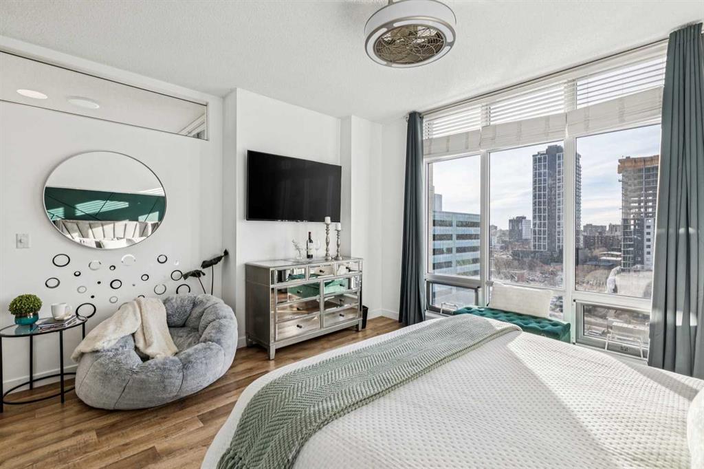 The spacious living room showcases floor-to-ceiling windows with brand new motorized zebra blinds and direct access to a massive covered wraparound patio (almost 300 square feet) perfectly extending your living space for entertaining or relaxing while enjoying stunning south facing Beltline views.