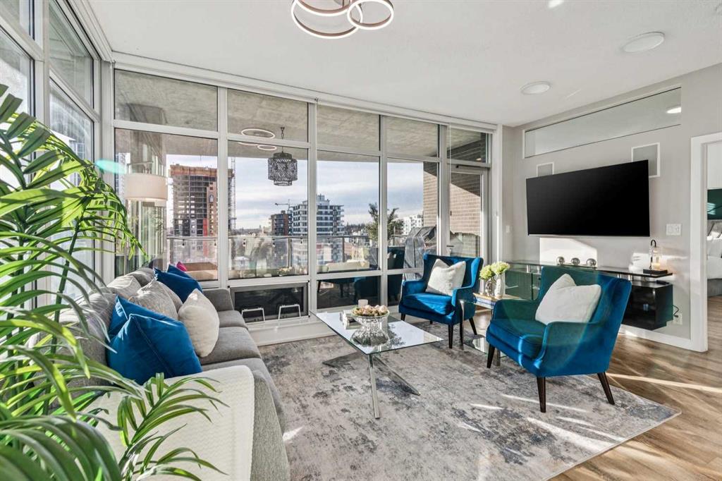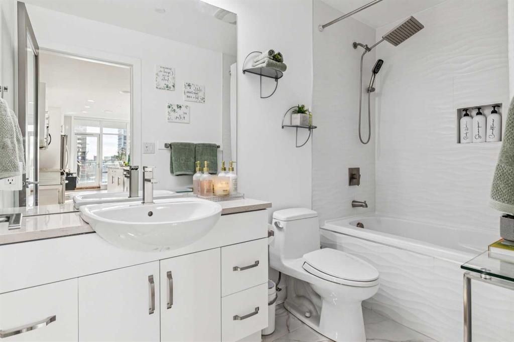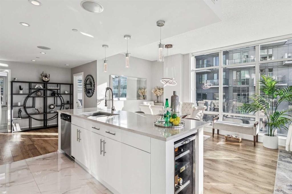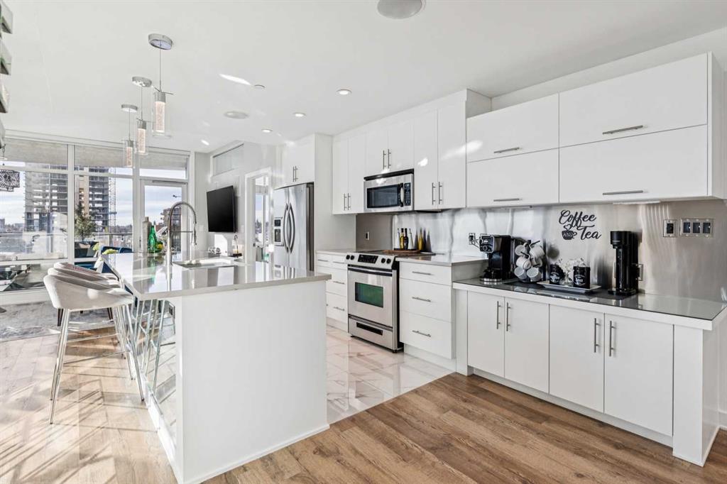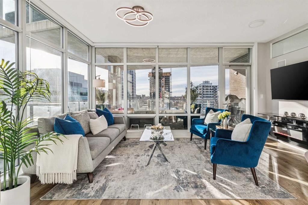 The spacious living room showcases floor-to-ceiling windows with brand new motorized zebra blinds and direct access to a massive covered wraparound patio (almost 300 square feet) perfectly extending your living space for entertaining or relaxing while enjoying stunning south facing Beltline views.