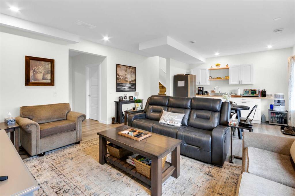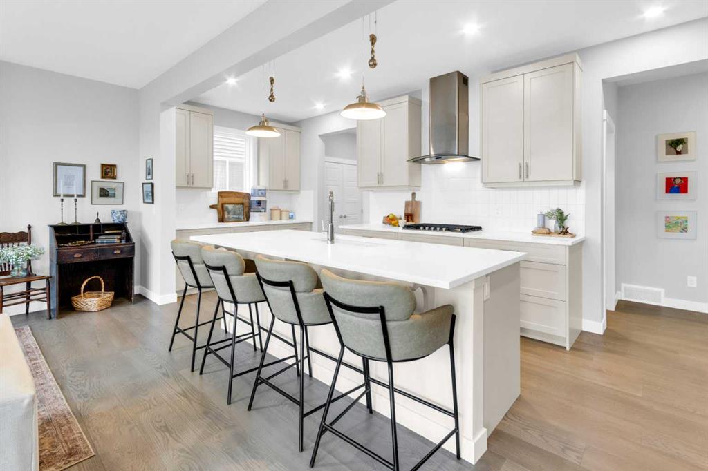 Located in the prestigious community of Rivercrest, this beautifully designed home offers nearly 3,500 sqft. of finished living space, thoughtfully crafted for both comfort and elevated everyday living. Flooded with natural light and positioned to capture stunning views of downtown Cochrane and mountain views to the west. This home features 3 spacious bedrooms on the upper floor plus a main-floor flex room, ideal as a private home office or 4th bedroom with the added versatility of a Murphy bed, along with a 1-bedroom suite on the lower level. The main level welcomes you with 9 ft ceilings, a spacious foyer and a seamless open-concept layout anchored by expansive windows and a large sliding patio door. The kitchen is both stylish and functional, featuring an expansive 8’ island, ample counter space, and built-in appliances, perfect for entertaining and everyday living. The living and dining areas are warmed by a cozy fireplace, creating an inviting atmosphere for gatherings and quiet evenings alike.