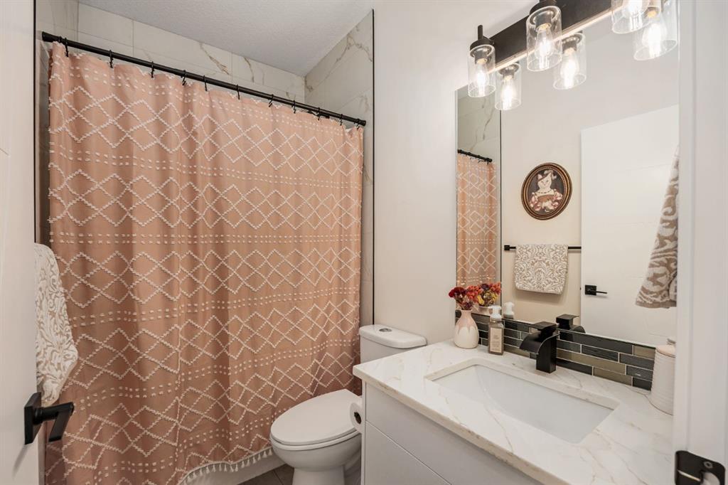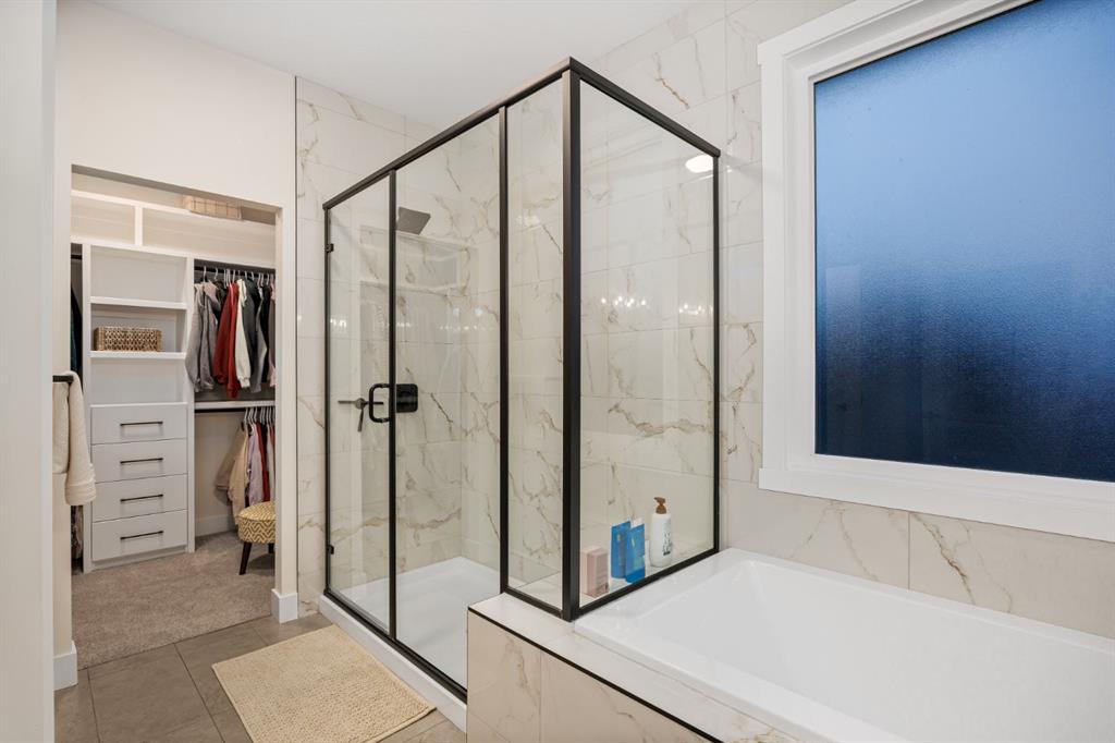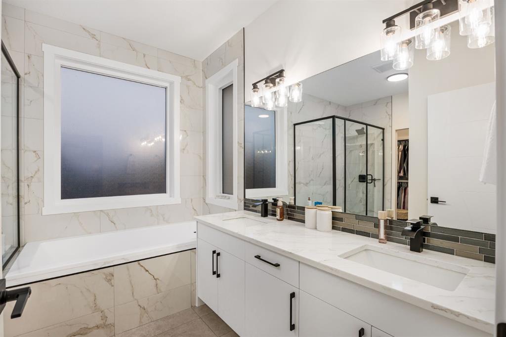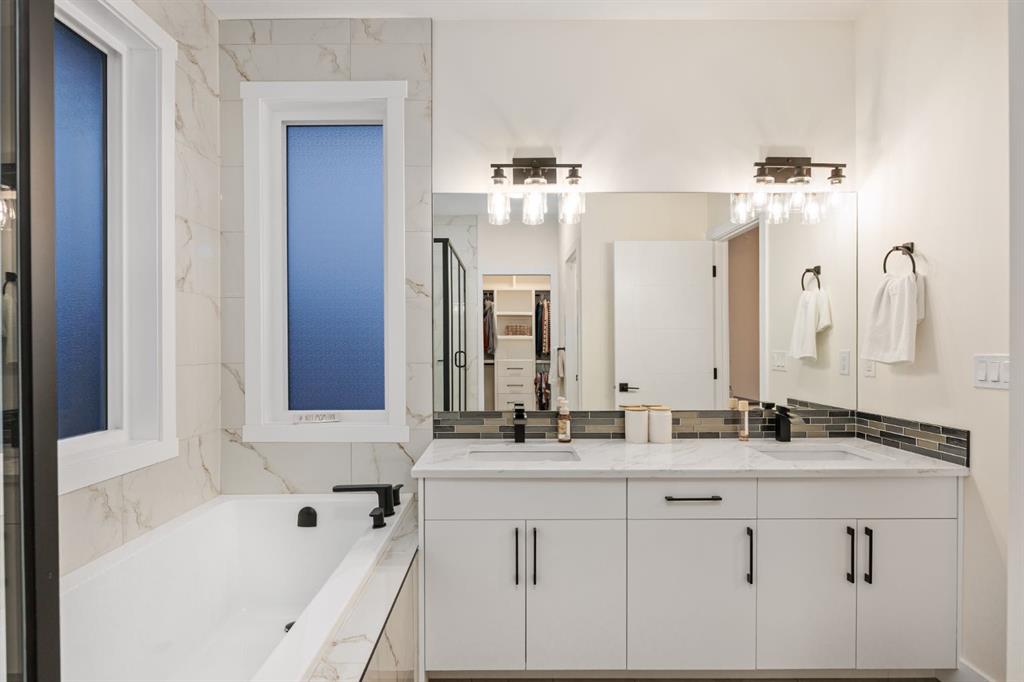 Upstairs features a vaulted ceiling opening into a massive bonus room, upper laundry with tile flooring and quartz counters, and three generously sized bedrooms. The primary retreat offers a spa-inspired ensuite with dual quartz vanity, 5’ soaker tub, floor-to-ceiling tiled shower, a private toilet room, and a walk-in closet with custom built-ins. A stylish 4-piece bathroom completes the level.
