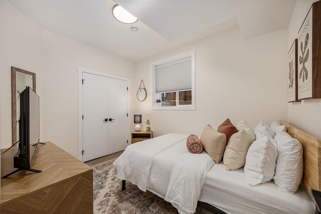 The fully developed walkout basement extends the living space with 9’ ceilings, luxury laminate flooring, a spacious family room, and a custom 10’ wet bar with quartz counters, tile backsplash, and built-in cabinetry. Two large bedrooms, a 4-piece bathroom, mechanical room, and under-stair storage complete the lower level.