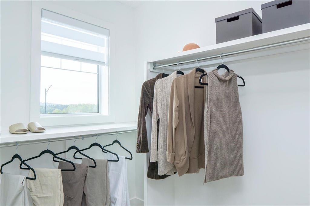 As you head upstairs, the metal railing continues beyond the staircase and throughout the upper floor. The primary bedroom has it all, including a vaulted ceiling, a massive walk in closet with MDF shelving, and a grand five piece ensuite with double sinks and a five foot wide tiled shower. The spare bedrooms are located at the rear of the home, offering excellent separation for homeowners. The large laundry room includes a counter, cabinets above the washer and dryer, and additional shelving for linens.