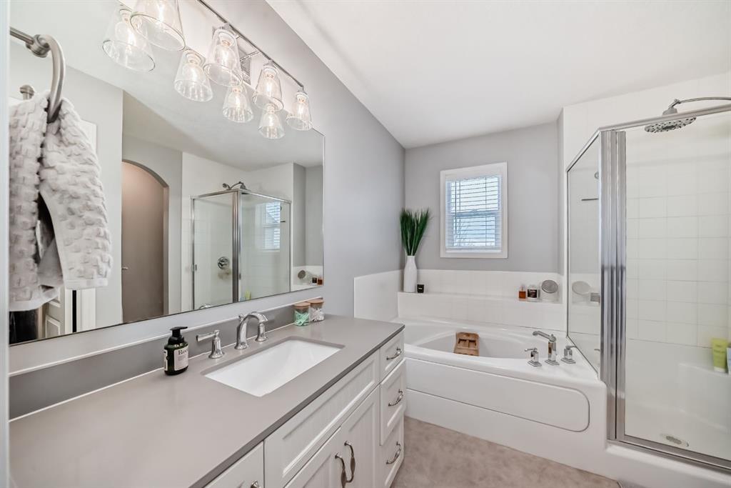 The primary suite is tucked quietly at the rear of the home and features a walk in closet and a well appointed ensuite with deep soaker tub and separate shower, creating a relaxing retreat at the end of the day.