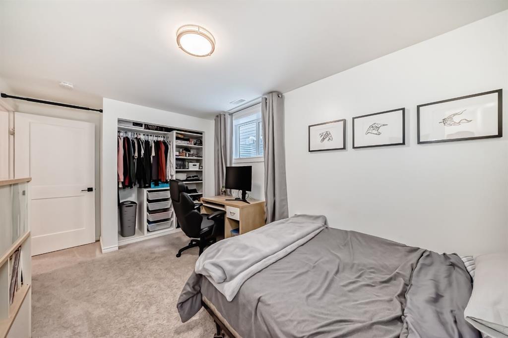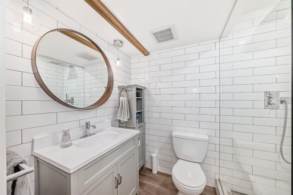 The professionally developed basement expands the home’s living space with a stylish recreation area featuring a modern electric fireplace feature wall, a unique barn door accent, and a beautiful spa-inspired bathroom ideal for guests, movie nights, or a quiet escape.