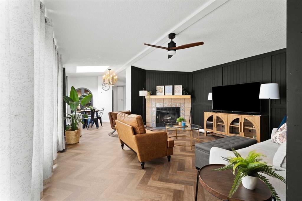 breakfast bar, built-in features, ceiling fan(s), chandelier, closet organizers, double vanity, high ceilings, kitchen island, low flow plumbing fixtures, natural woodwork, no smoking home, open floorplan, pantry, quartz counters, storage, vinyl windows, walk-in closet(s), wired for data, wired for sound